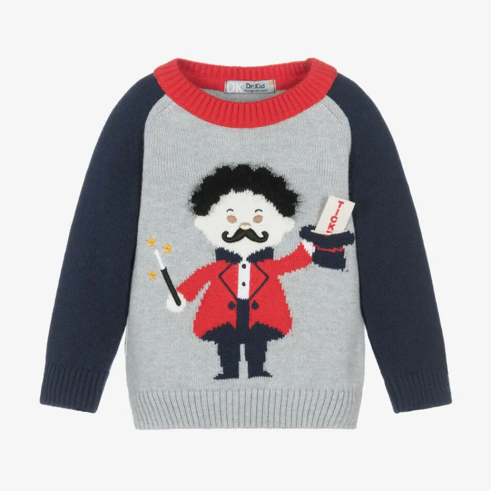 Circus-themed grey sweater for younger boys by Portuguese brand Dr. Kid, knitted in a soft blend of cotton and wool. This cosy top has navy blue long sleeves and a red crew neck. There is a fun intarsia knit ringmaster on the front with fluffy hair, embroidery detailing and a ticket appliqué popping out of his top hat. To help with dressing, smaller sizes have button fastenings on one shoulder.