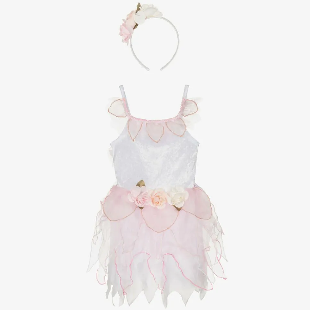 Pretty pink Rose Fairy costume for girls from Dress Up by Design. Made from soft velour, the white bodice has pink tulle wings attached to the back and a sweet layered organza skirt. There is a silky underskirt and partially elasticated waist for added comfort. The lovely flower embellishments on the waist match the details on the hairband for a coordinated look.