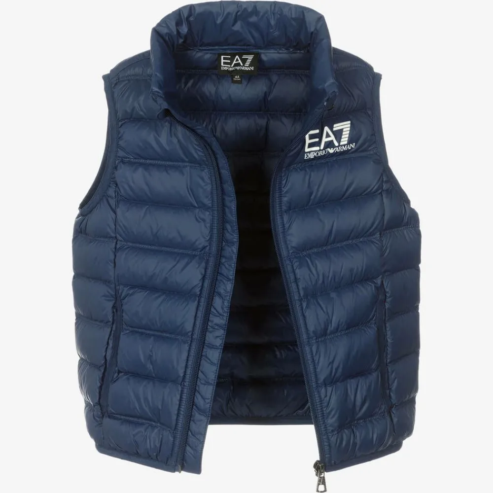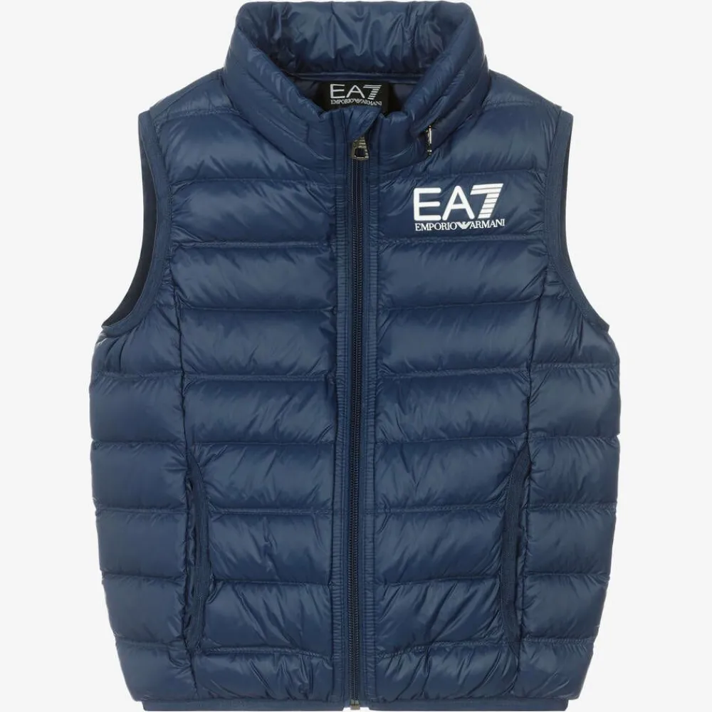 Navy blue gilet for boys by EA7 Emporio Armani. Silky smooth and ultra-lightweight, this down-filled gilet has a branded front zip fastening, functional front pockets, and a useful concealed hood. It has an elasticated hem for a secure and comfortable fit. Ideal for layering, this packable gilet is versatile and easily stored away in a pouch bag when not in use.