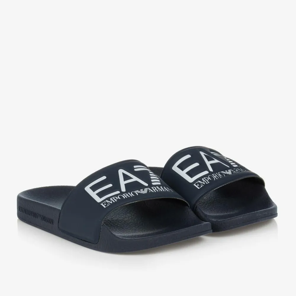 Navy blue sliders for boys and girls from EA7 Emporio Armani, cool for the pool, on the beach or to compliment everyday casual outfits. These easy slip-ons are made from soft rubber with a moulded footbed for comfort. They have a bold white logo embossed across the strap for instant recognition and an additional branding moulded on the sole.