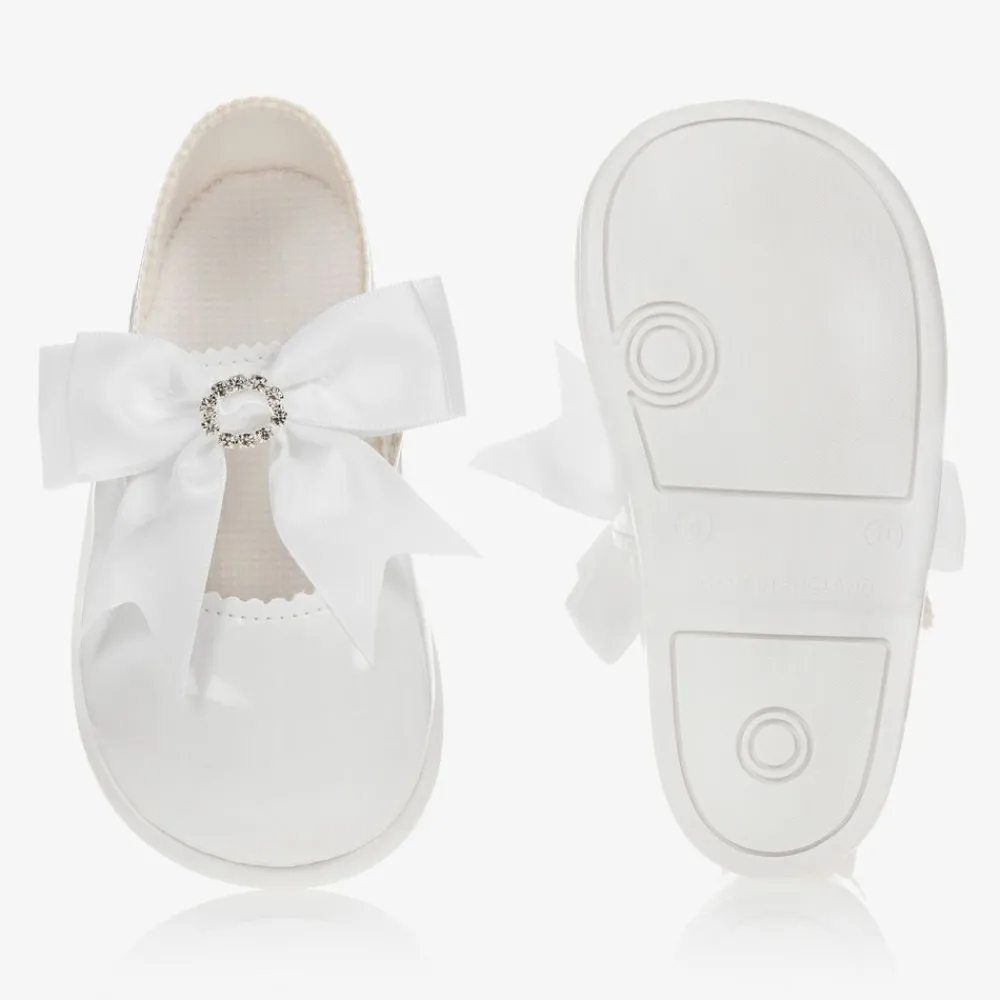 White first walker shoes for little girls by Early Days Baypods, made in soft patent faux leather. They have a soft flexible sole and a comfortable lightly padded insole, with large ribbon bows and diamanté trims.