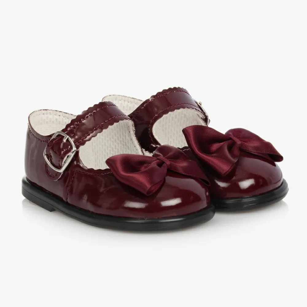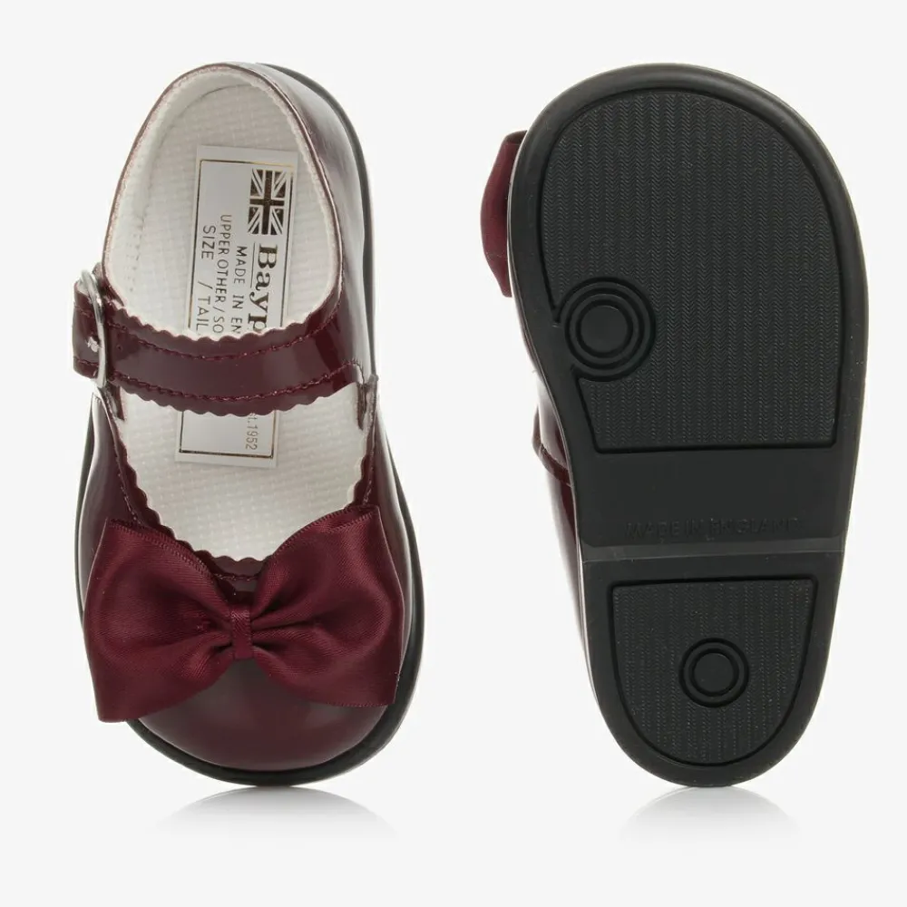 Girls smart, burgundy red patent shoes with satin bows, by Early Days. Made in soft faux patent leather, they have a lightly padded fabric lining. There are black non-slip rubber soles and they fasten with an adjustable buckle. They come with pretty scalloped edges.