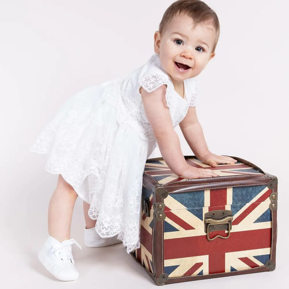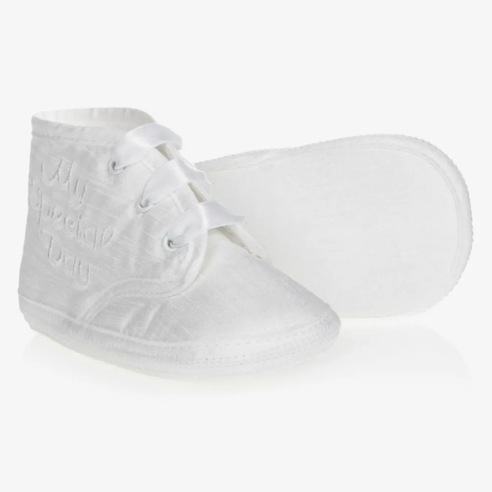 Gorgeous little white silk dupion booties by Early Days, with satin laces and "My Special Day" embroidery on the sides. Suitable for baby boys and girls, they have a soft and absorbent insole and lining.
