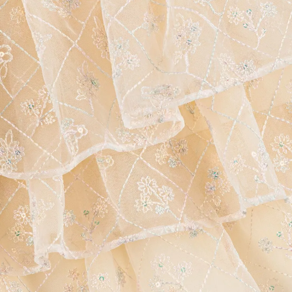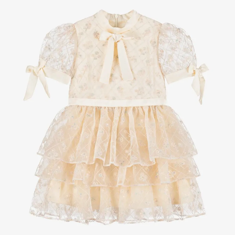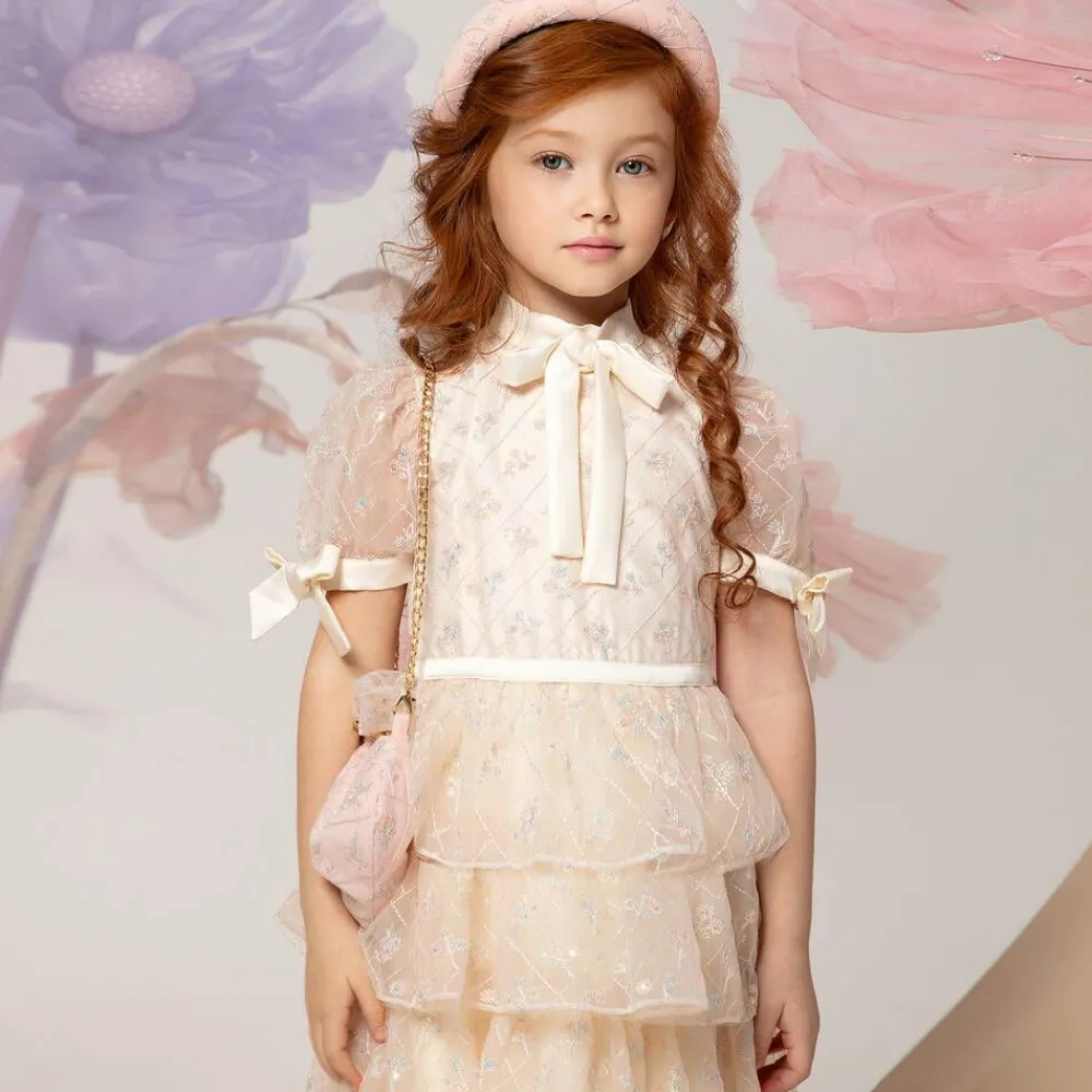 Shimmering dress for girls by EIRENE, designed with special occasions in mind. Made in sumptuous ivory satin with a pink tulle overlay, it is embroidered with a pink, blue and ivory diamond pattern, embellished in sequinned flowers that catch the light beautifully. It has a stand-up satin collar with a fixed bow below, matching the bows on the cuffs of the sheer, puffed sleeves. The tulle tiers on the skirt have layers of tulle below for extra volume and swish. Fully lined in voile for comfort, there is a concealed zip fastening on the back.