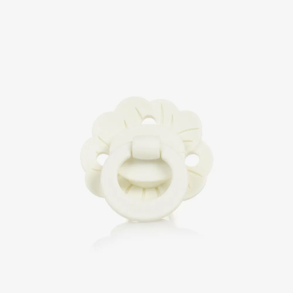 A pretty, off-white floral dummy for baby girls by Elodie, a unique shape for the Swedish brand. It features a symmetrical silicone teat and the flower-shaped shield has three ventilation holes to allow air circulation and prevent skin irritation. It is completely free from harmful substances such as BPA, phthalates, and PVC.