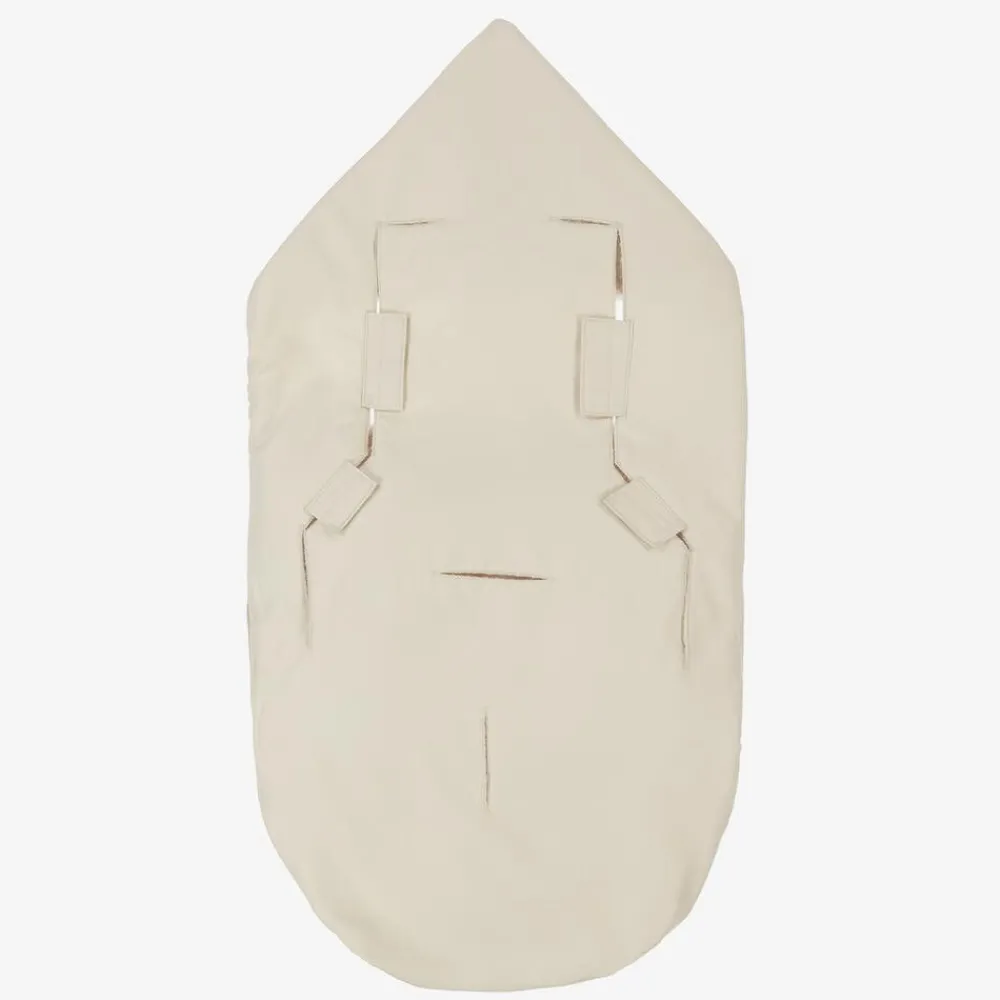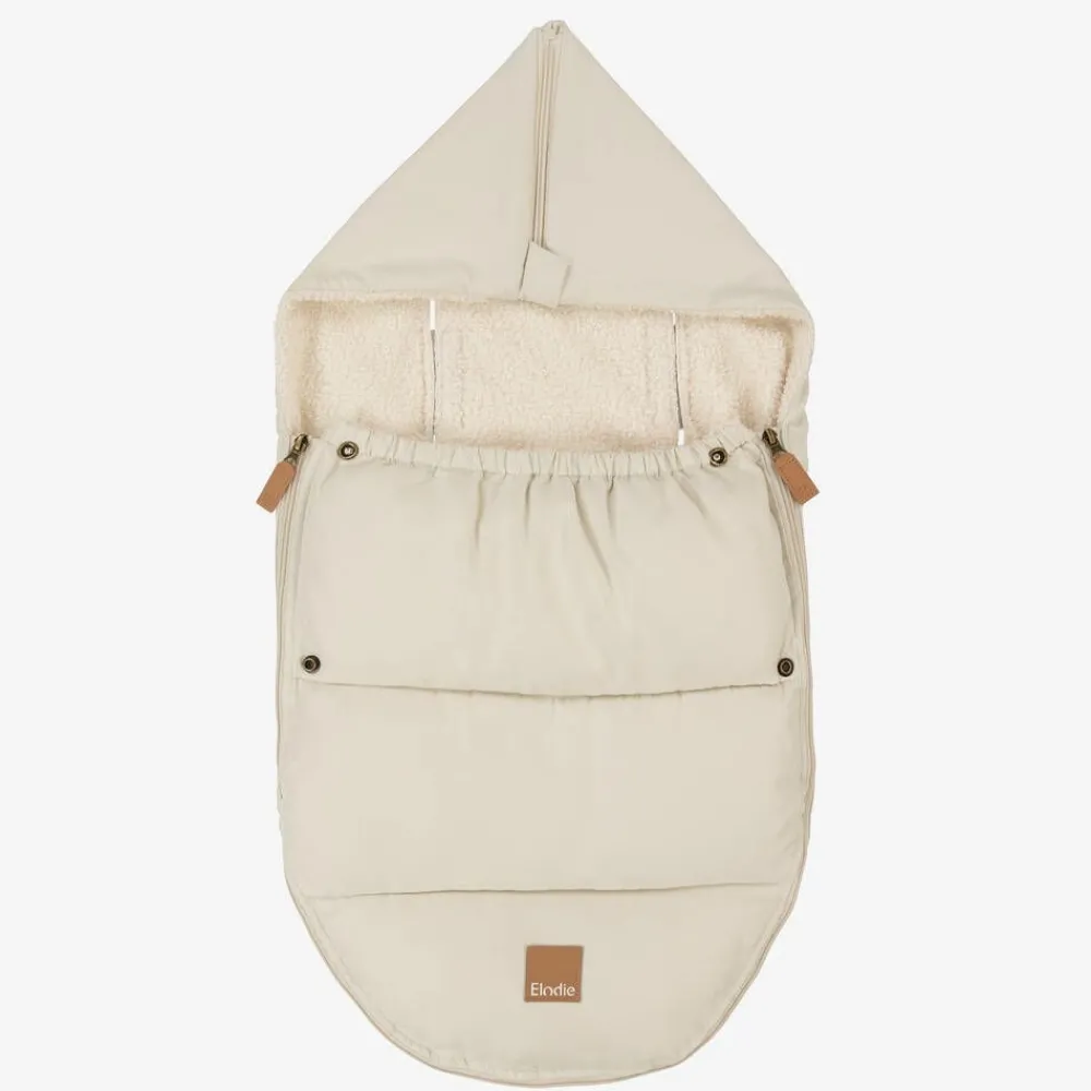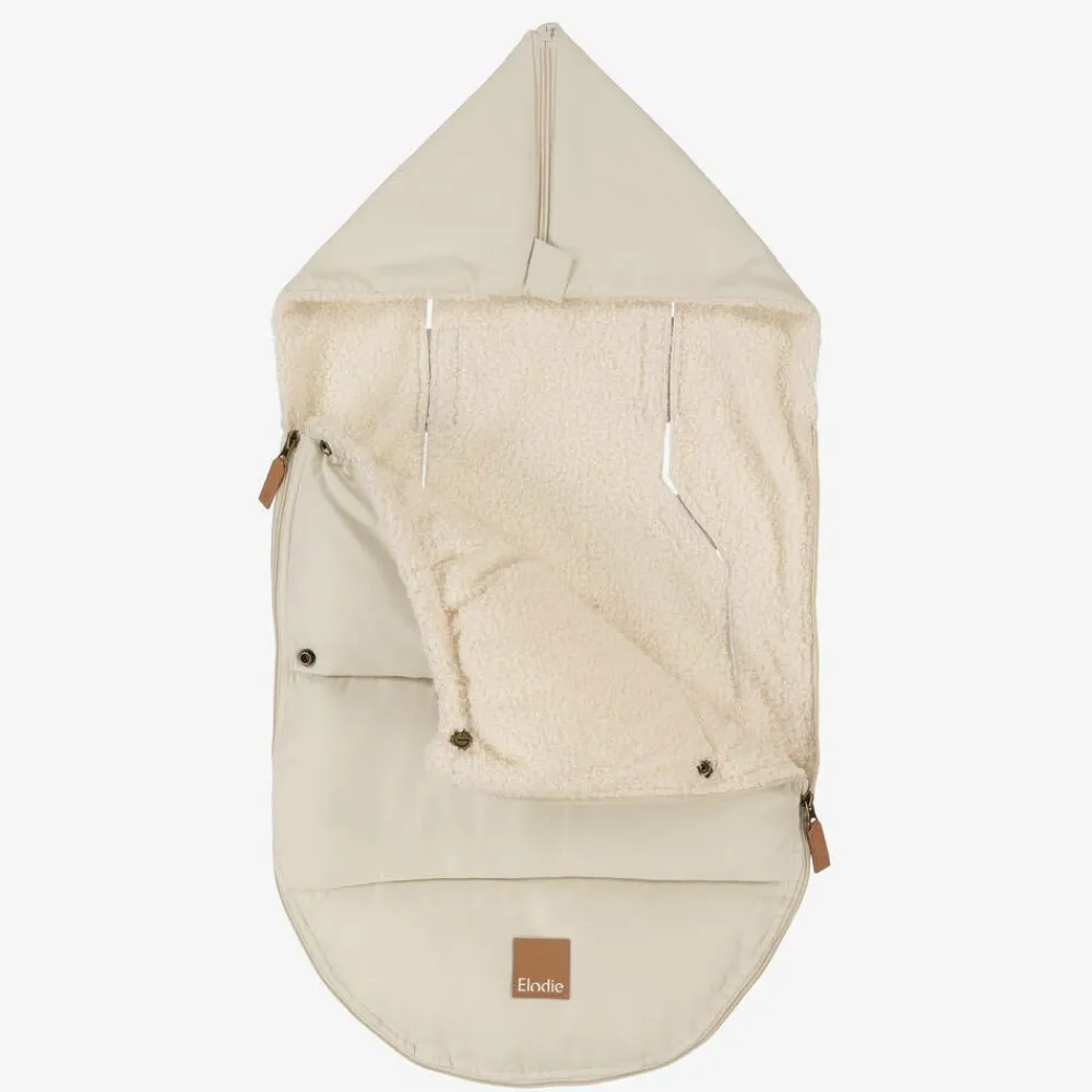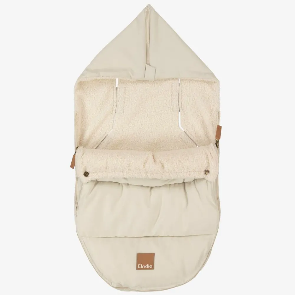 A dark ivory padded nest for baby boys and girls by Swedish brand Elodie. Super soft and comfortable, it has a zip fastening that opens at both ends to make it easy to get little ones in and out. Water repellent and lined in cosy bouclé fleece, the front flap can be folded down with popper fastenings or removed in warmer temperatures. Designed with a large fold-away hood, there are pre-cut holes at the back with velcro fastenings for attaching to a car seat.
