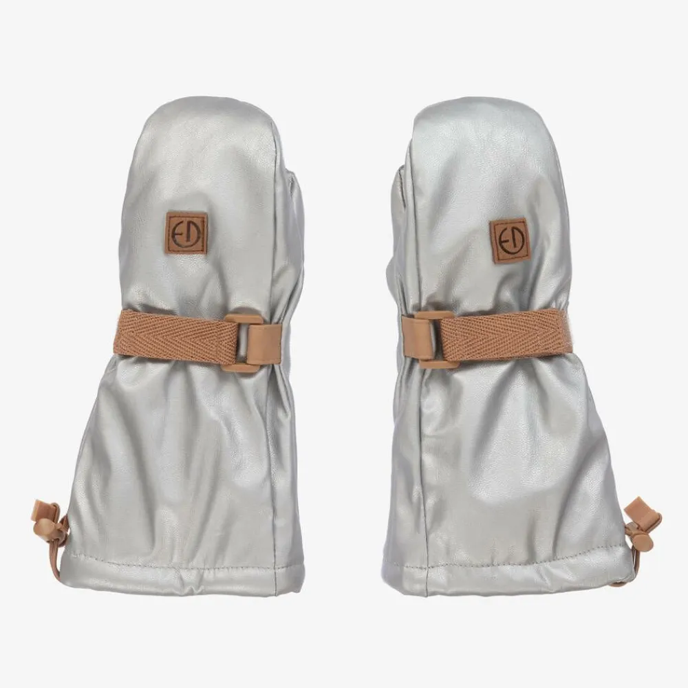 Silver faux leather mittens for little boys and girls by Elodie, with a soft polar fleece lining for cosy warmth. Thoughtfully designed, they have a wide wrist opening with a toggle drawstring cord, a velcro-adjustable wrist strap and a discreet zip opening to guide little thumbs in to place.