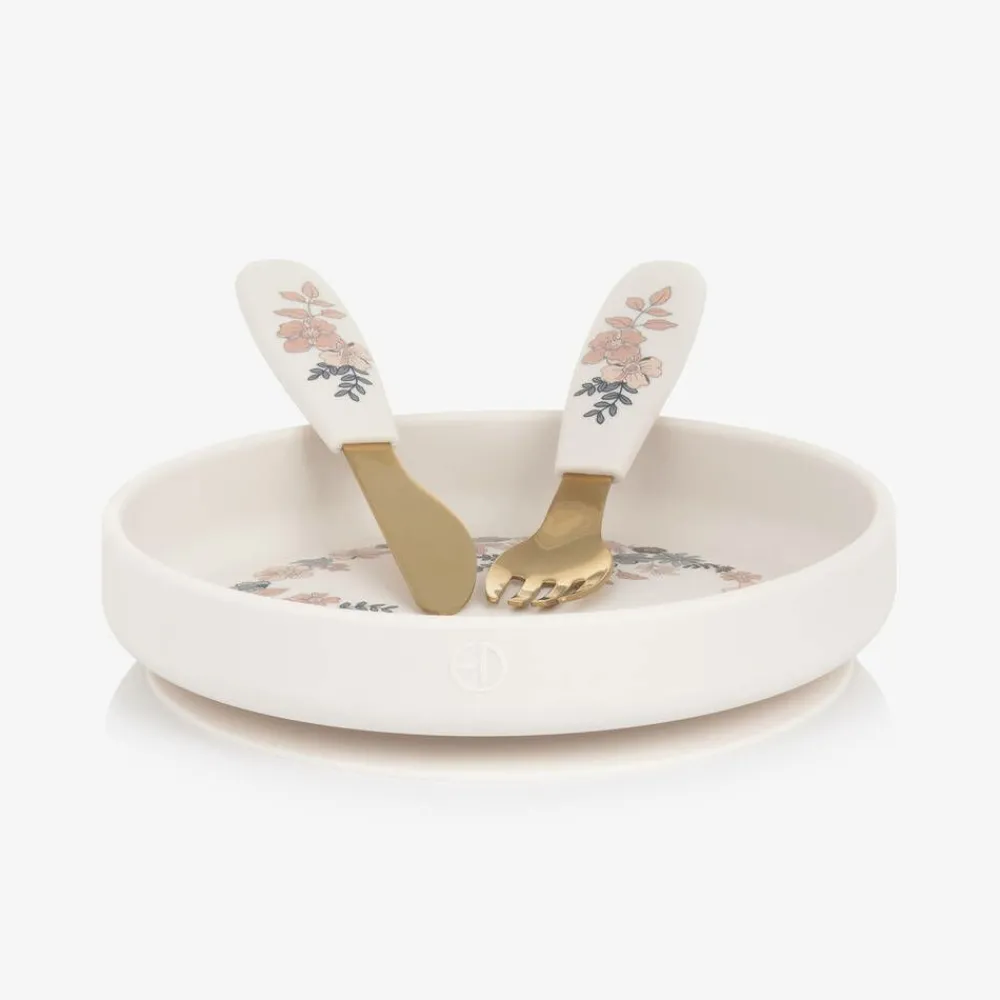 Elodie Lunch Accessories*Girls Ivory Floral Silicone Plate & Cutlery Set