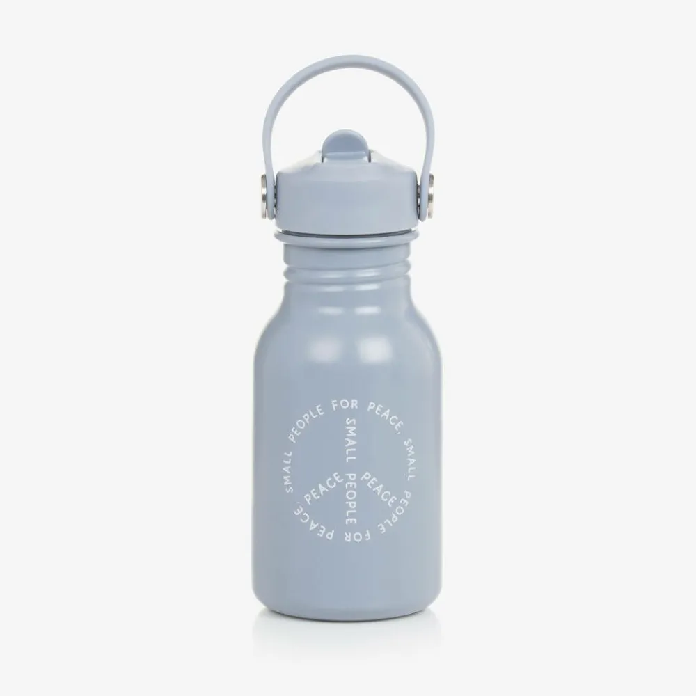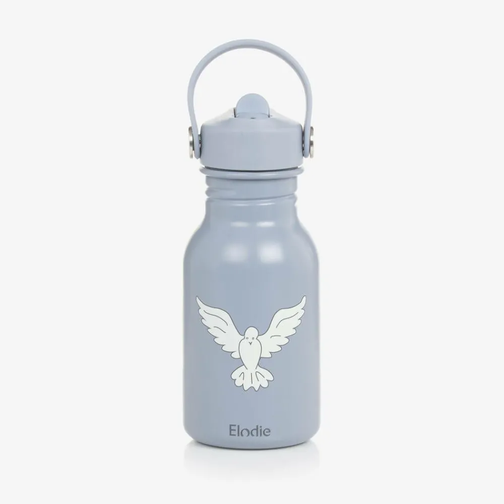 A grey-blue water bottle for boys and girls by Elodie, printed with a white dove and peace motif. Designed for little hands, this lightweight bottle is made from durable, food grade stainless steel and comes with a useful carry handle on the top. Ideal for all their adventures, it has a foldable straw cap, making it spill-free and keeping it clean and hygienic for longer.
