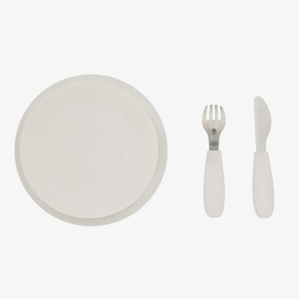 A white and black dalmation print feeding plate and cutlery set for little boys and girls by Elodie. Made in BPA-free, food-grade silicone, the feeding plate is virtually unbreakable and can be heated in the microwave. The raised sides encourage self-feeding and a smart suction ring attaches it to any smooth surface. The stainless steel fork and knife have chunky, silicone handles, ideal for little hands to grip.