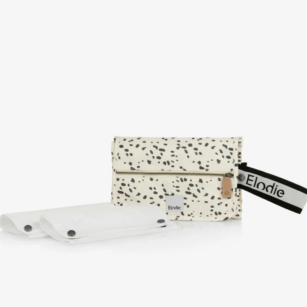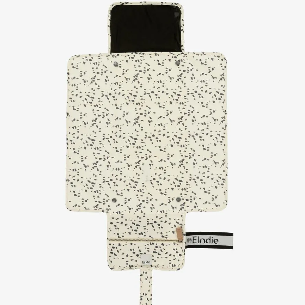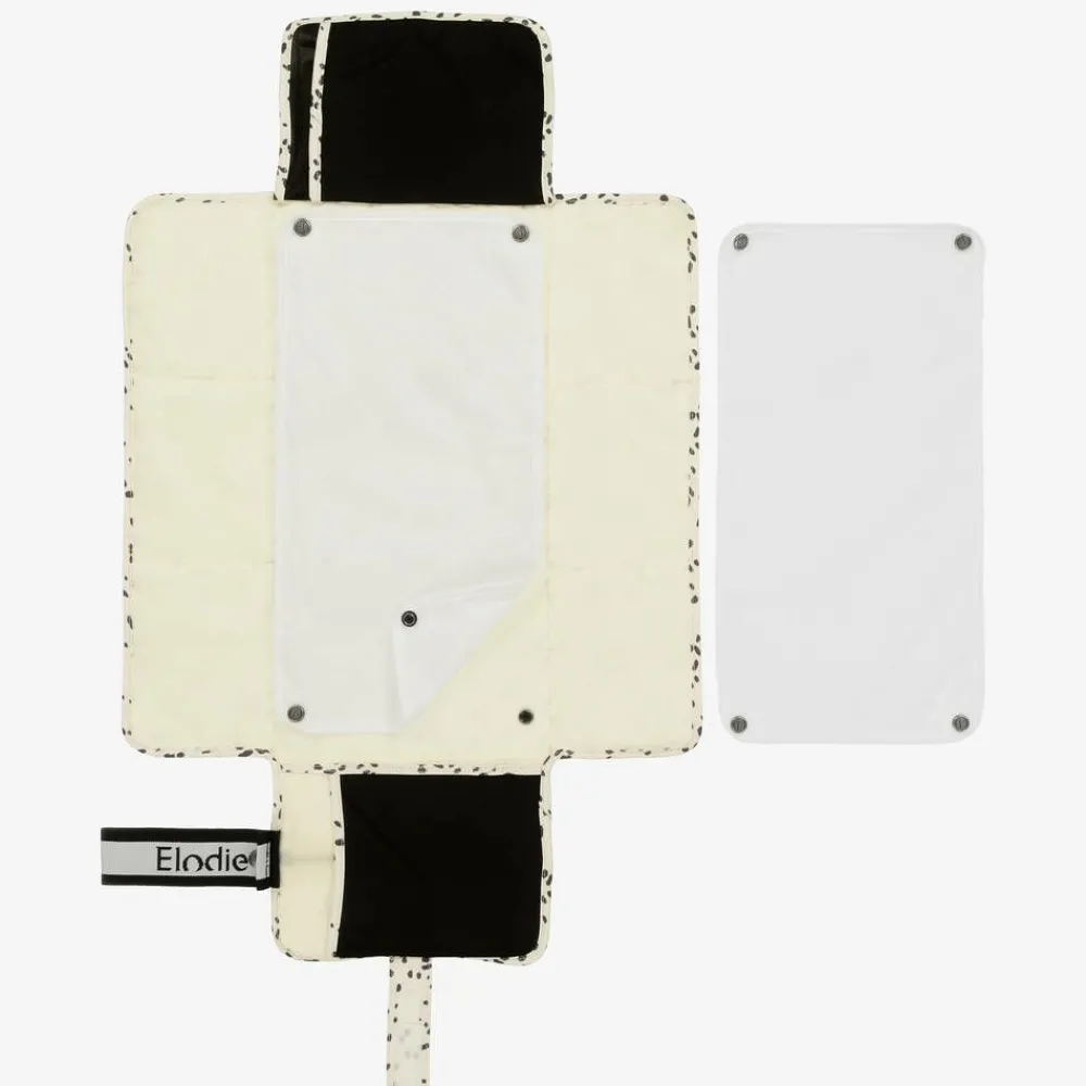 An ivory portable changing mat by Scandi brand Elodie, in a lovely dalmatian print. There are multiple slip pockets and a zipped front pocket for organising nappies, wipes and creams on the go. Fully unfolded, the inside features a soft terry towelling mat, easily detachable with poppers for washing. It secures with velcro and has a branded black and white woven carry handle to hook onto a stroller or simply carry on the wrist.