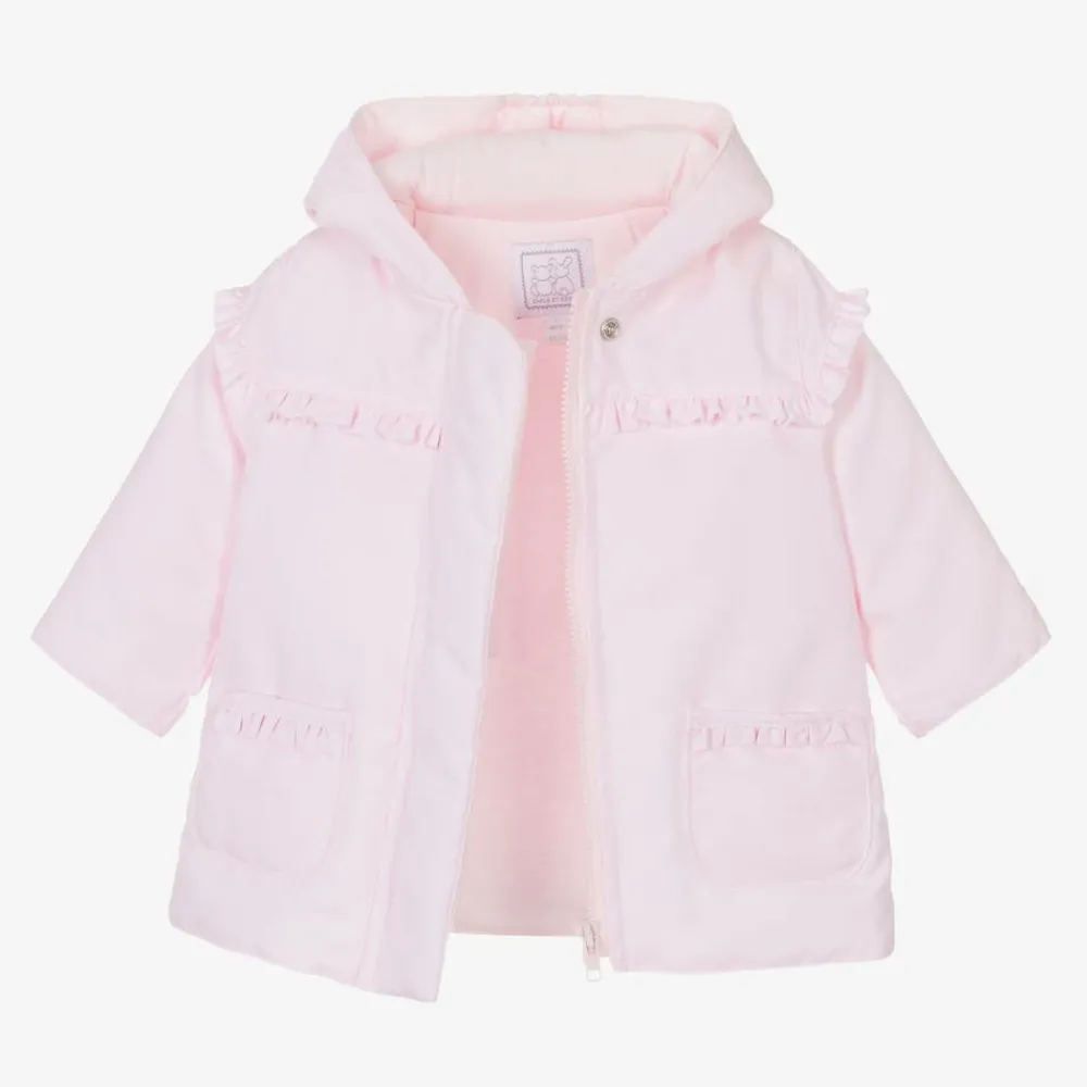 Cute pink hooded coat for baby girls from Emile et Rose, with pretty ruffle trims. Soft, smooth and lightly padded, the coat has a comfortable cotton-blend jersey lining. There are sweet patch pockets on the front and the coat has an easy, concealed zip fastening, with a popper at the neck.