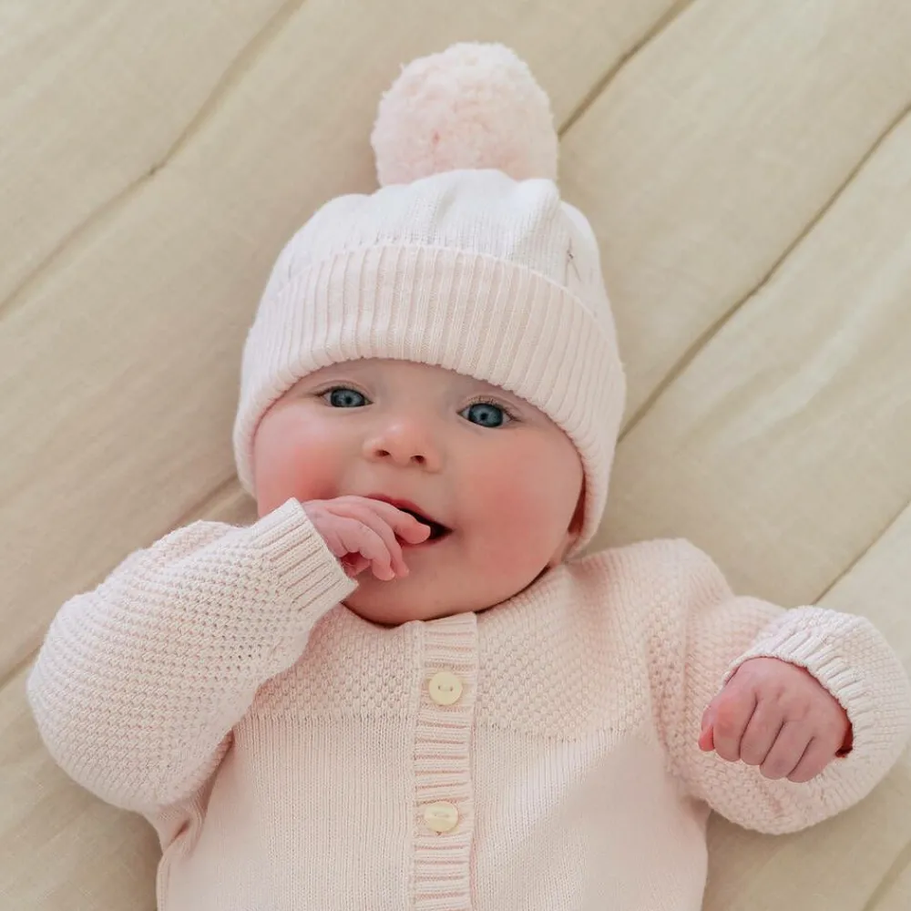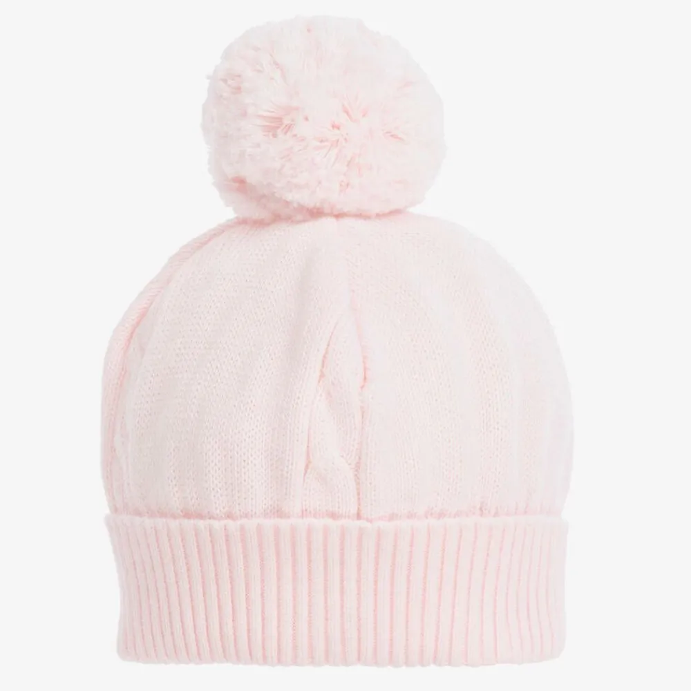 Cosy pale pink hat for baby girls, by Emile et Rose. Beautifully knitted in super soft cotton, it has lovely cable knit details, a pom-pom on the top, and a ribbed turned-up brim.