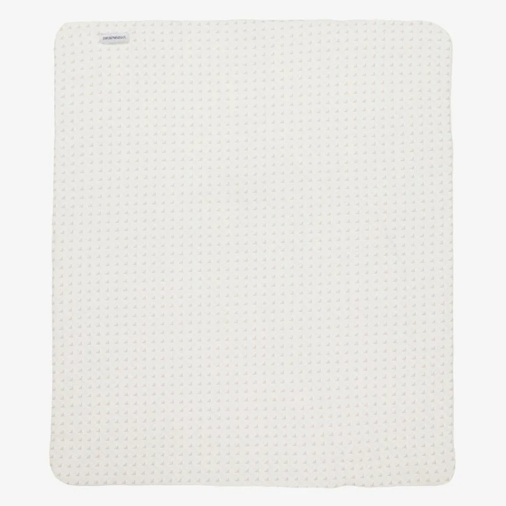 A beautiful ivory and beige padded blanket for baby boys and girls by Italian brand Emporio Armani. For instant designer appeal, it is printed with the signature Eagle logos. Made in soft and gentle cotton jersey and lightly padded for comfort, the blanket is an ideal surface on which to lay baby and makes a lovely nursery accessory.