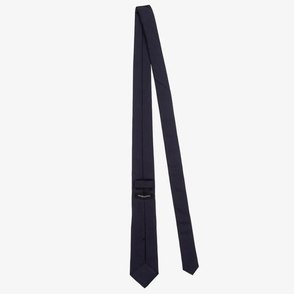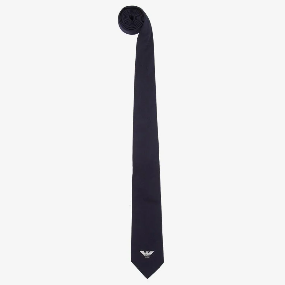 Smart navy blue tie for boys by Italian brand Emporio Armani, made in luxurious silk twill. It has a white jacquard Eagle logo on the tip for a signature finishing touch and a silky viscose blend lining to keep it in shape.
