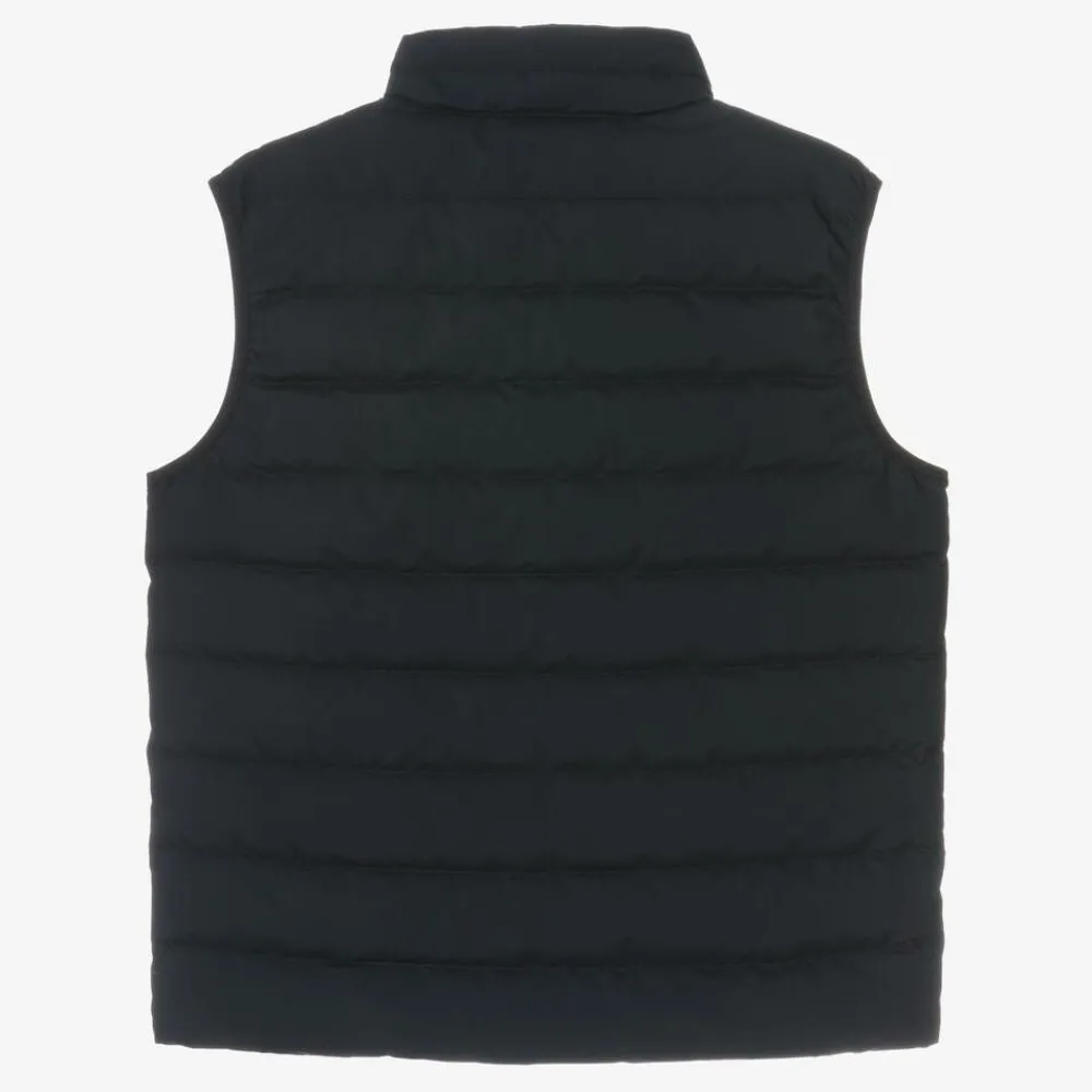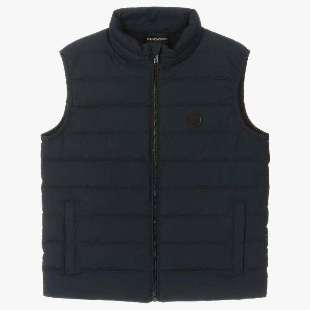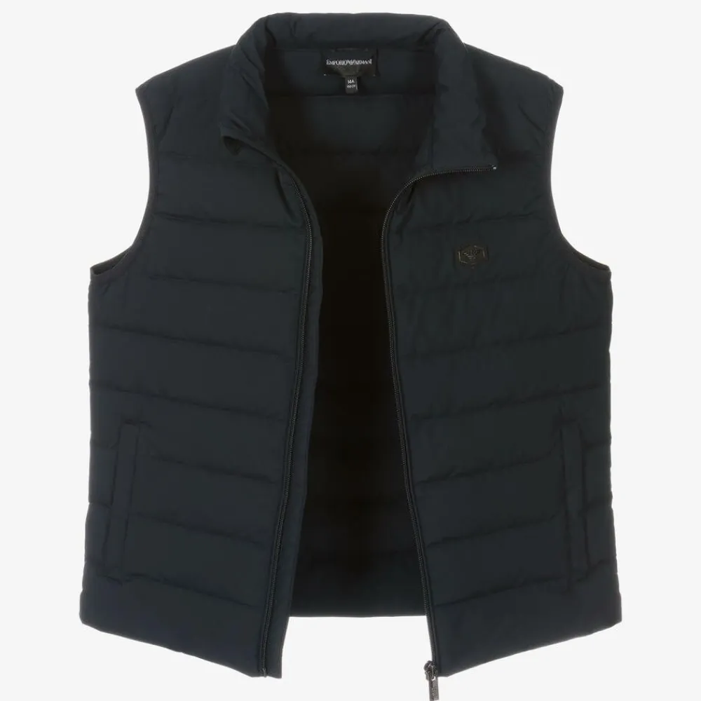Teen boys navy blue zip-up gilet from Emporio Armani, luxuriously padded with recycled down. There is an Eagle logo patch on the chest, a signature emblem of the brand. Smooth and lightweight, it is a practical layering piece for added warmth. It has two front pockets secured with popper fastenings.