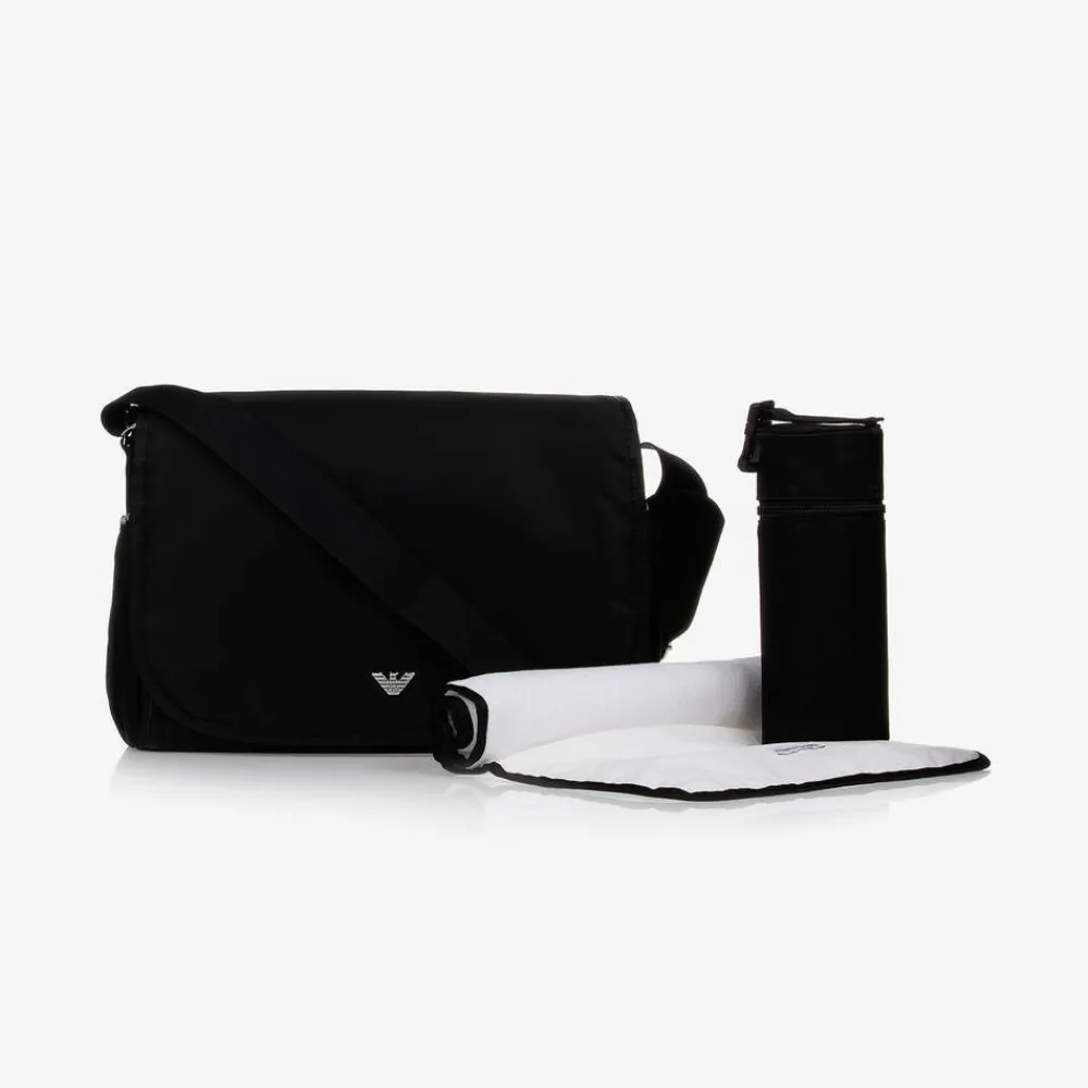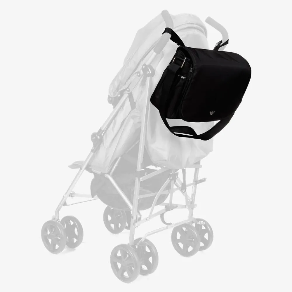 Practical and smart black Emporio Armani changing bag, with a silver-tone Eagle logo plate. Smooth with branded trims, the main compartment has multiple pockets for easy organisation and magnetic popper closure on the flap. It has an adjustable shoulder strap and fixed stroller straps which can be neatly tucked away when not in use. It comes with a foldable changing mat and an insulated bottle bag.