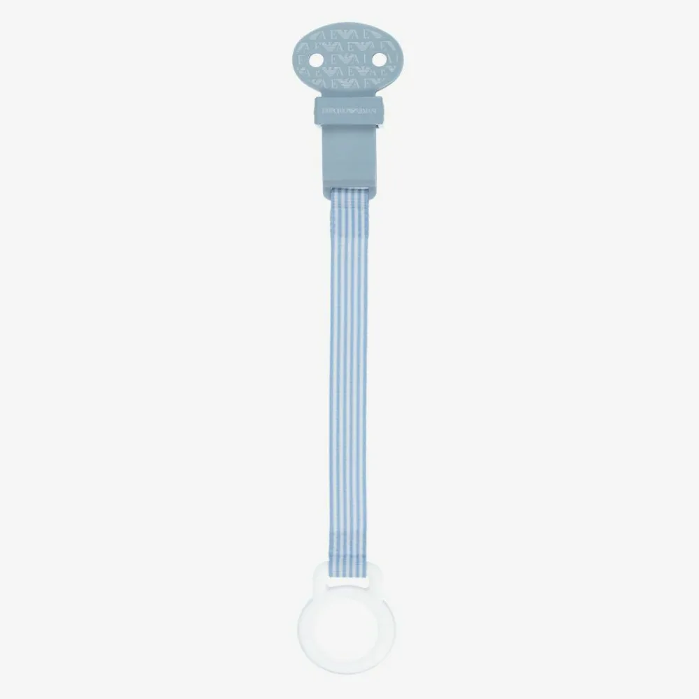 Baby boys pale blue dummy and clip set with the eagle logo branding by Emporio Armani. The dummy has an anatomical silicone teat with a hard plastic holder and a clip with a striped fabric strap to fasten onto clothing.