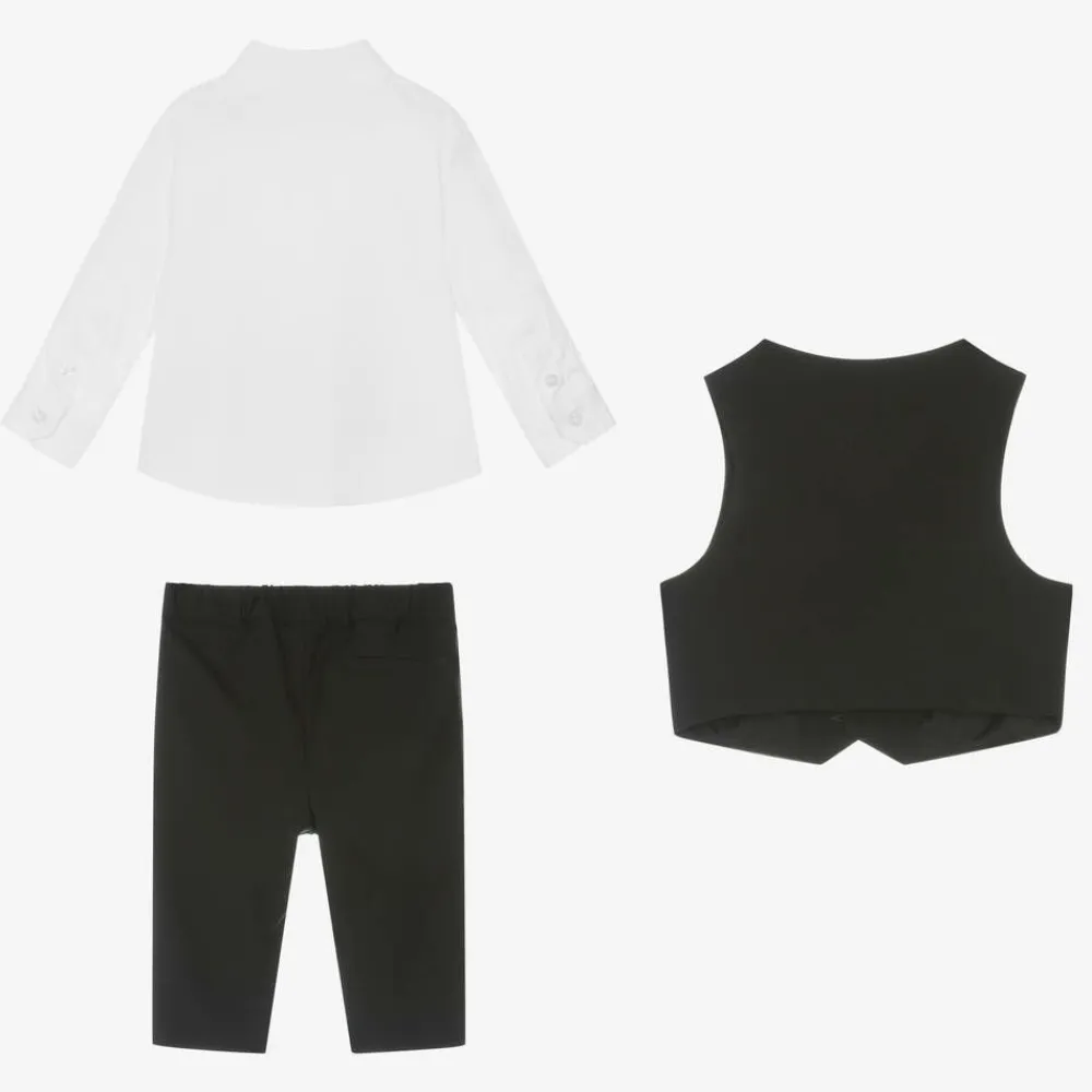 A smart black waistcoat suit for little boys by Emporio Armani, woven in luxurious wool with a silky lining. The trousers have elegant satin trims down the sides, with front pockets, and an elasticated waist for an ideal fit. The waistcoat is trimmed with faux pockets and fastens with branded buttons on the front. Complementing the suit is a white cotton poplin shirt that has added stretch for comfort.