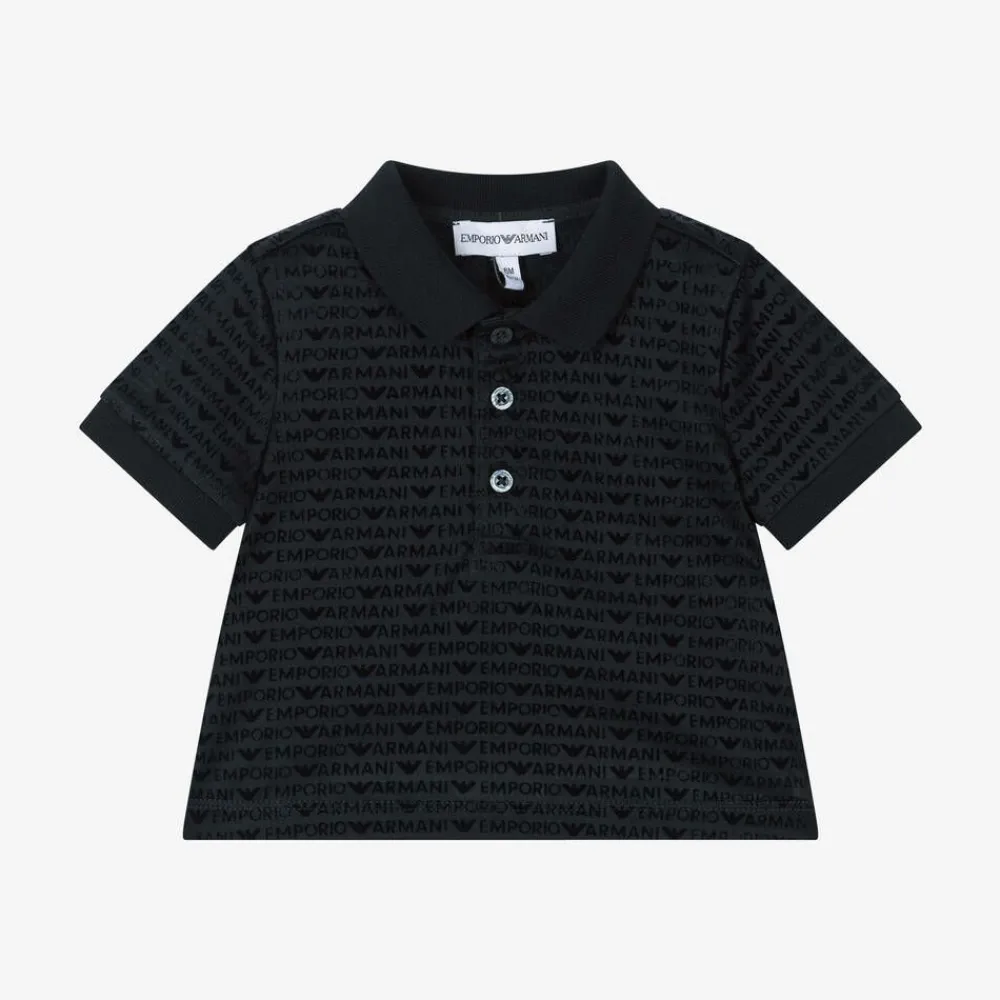 A navy blue polo shirt for baby boys by Italian brand Emporio Armani, made in a soft and comfortable lyocell and cotton blend jersey. Designed with a subtle sheen, this stylish top has flocked repeat logos printed all over. It has short sleeves and a ribbed collar and cuffs for a classic look and fastens with branded buttons on the front.