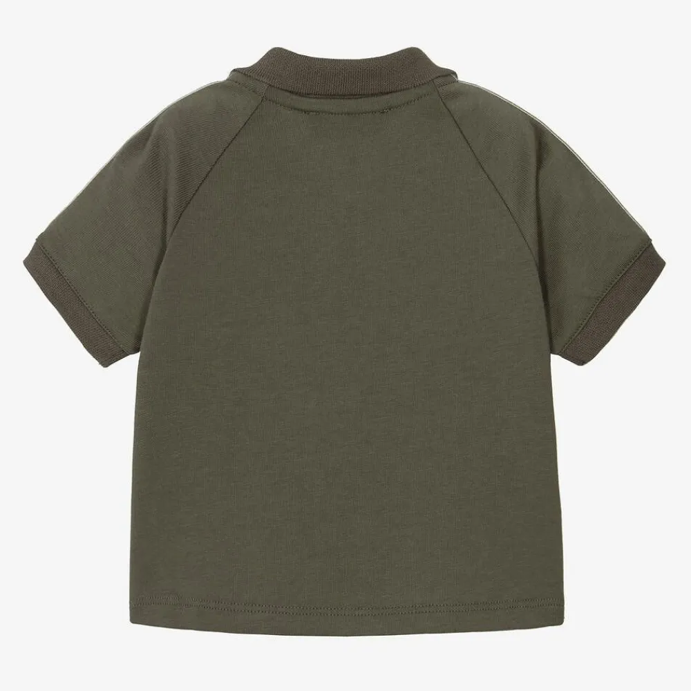 A moss grey polo shirt for little boys from Emporio Armani, made in soft cotton jersey. For instant designer appeal, the short sleeves are trimmed with embossed Eagle logo tape. Classic polo elements include a ribbed collar and cuffs, and a front placket fastening with branded buttons.