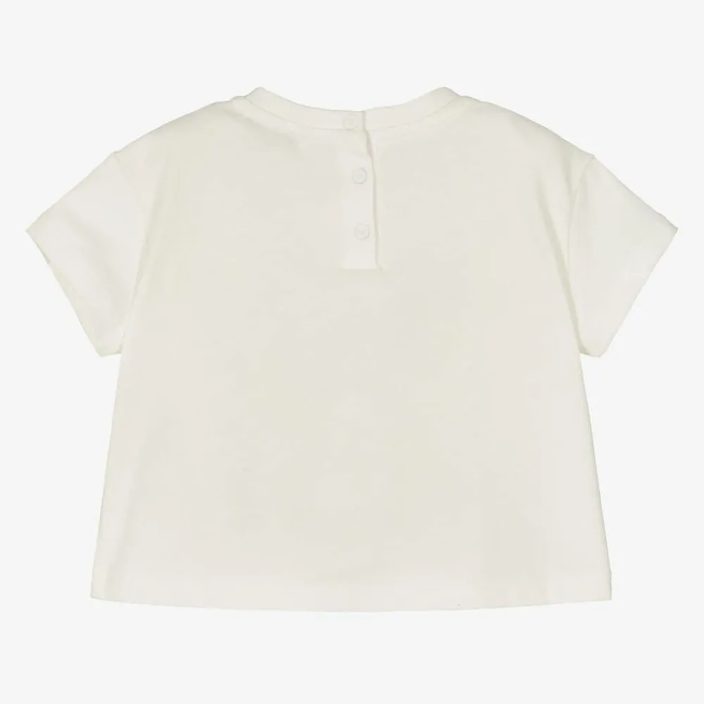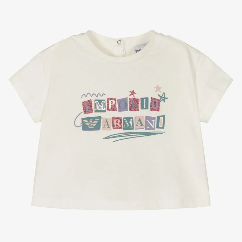 White short-sleeved T-shirt for little girls by Italian brand Emporio Armani. Adding a touch of designer sparkle, it has a glittery logo on the front in pink, purple and blue. Made in soft cotton jersey, this boxy fit top fastens easily with poppers on the back.