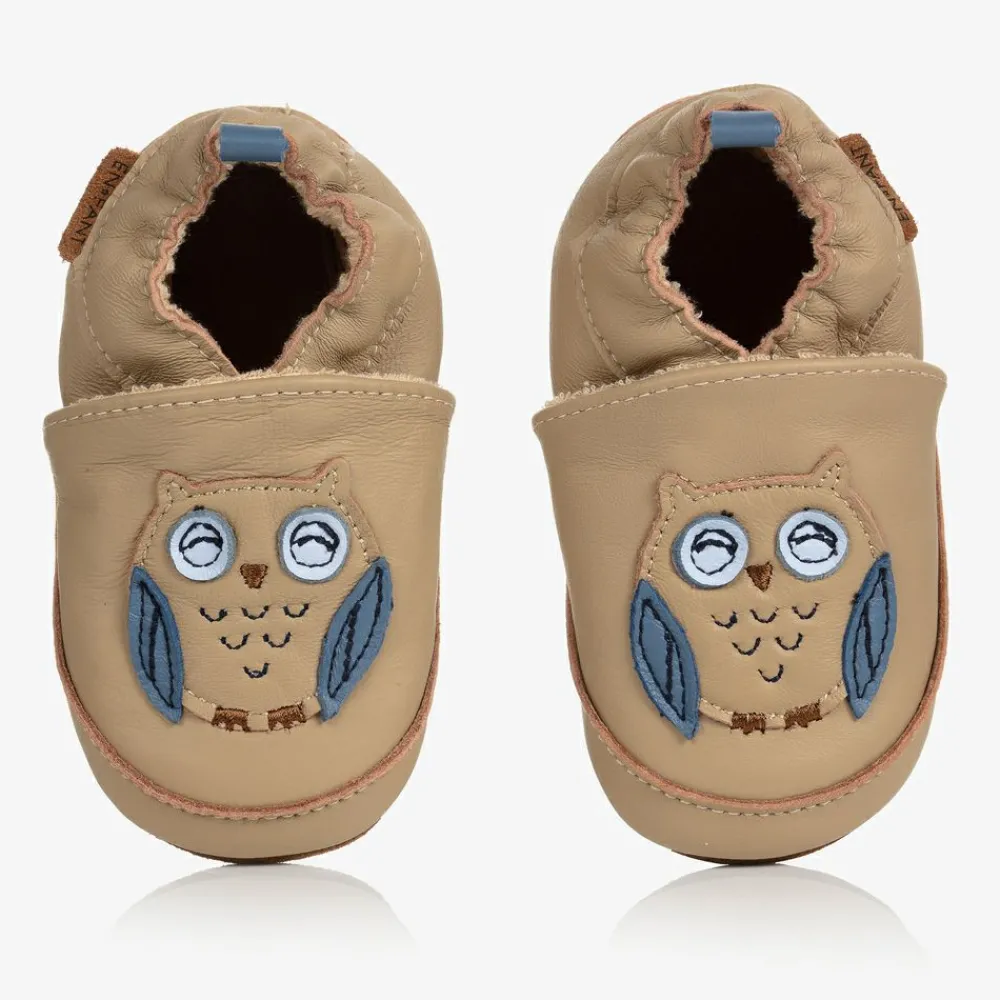 Beige slippers for younger boys and girls by EN FANT, with a cute owl stitched to the front. Made from beautifully soft and supple leather, these comfortable indoor shoes have soft suede soles, ideal for surfaces like wooden floors. Also suitable as a pre-walker shoe for babies, they slip on easily with stretchy elasticated backs and have a soft towelling lining.