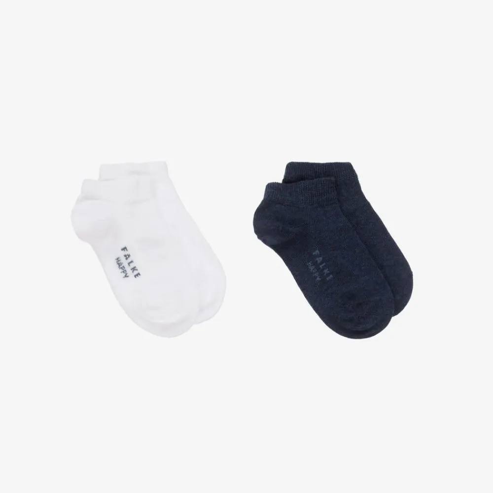 Two pairs of trainer socks for boys and girls by Falke, made in a soft, cotton rich blend with ribbed cuffs. Comfortable for everyday wear, one pair is navy blue and the other is white.