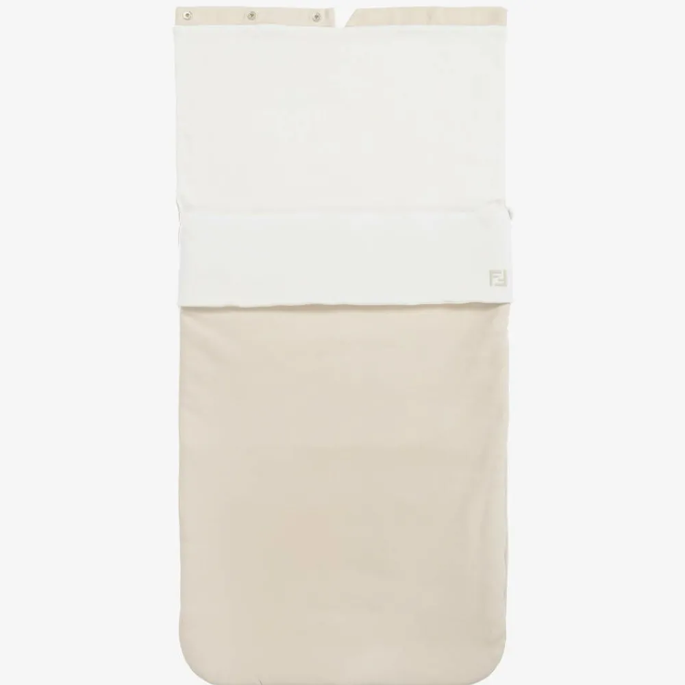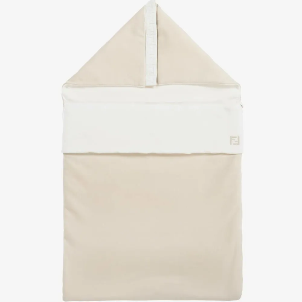Present baby in this lovely beige and white padded nest for baby boys and girls, by Italian luxury designer Fendi. Made in soft cotton jersey, it has delicately embroidered FF logos for subtle branded touches. It fastens easily with a zip along the side and bottom, helping to easily get baby in and out. The popper-fastening hood can be unfastened and laid flat, ideal for allowing extra room as they grow. The length is adjustable with poppers on the back.