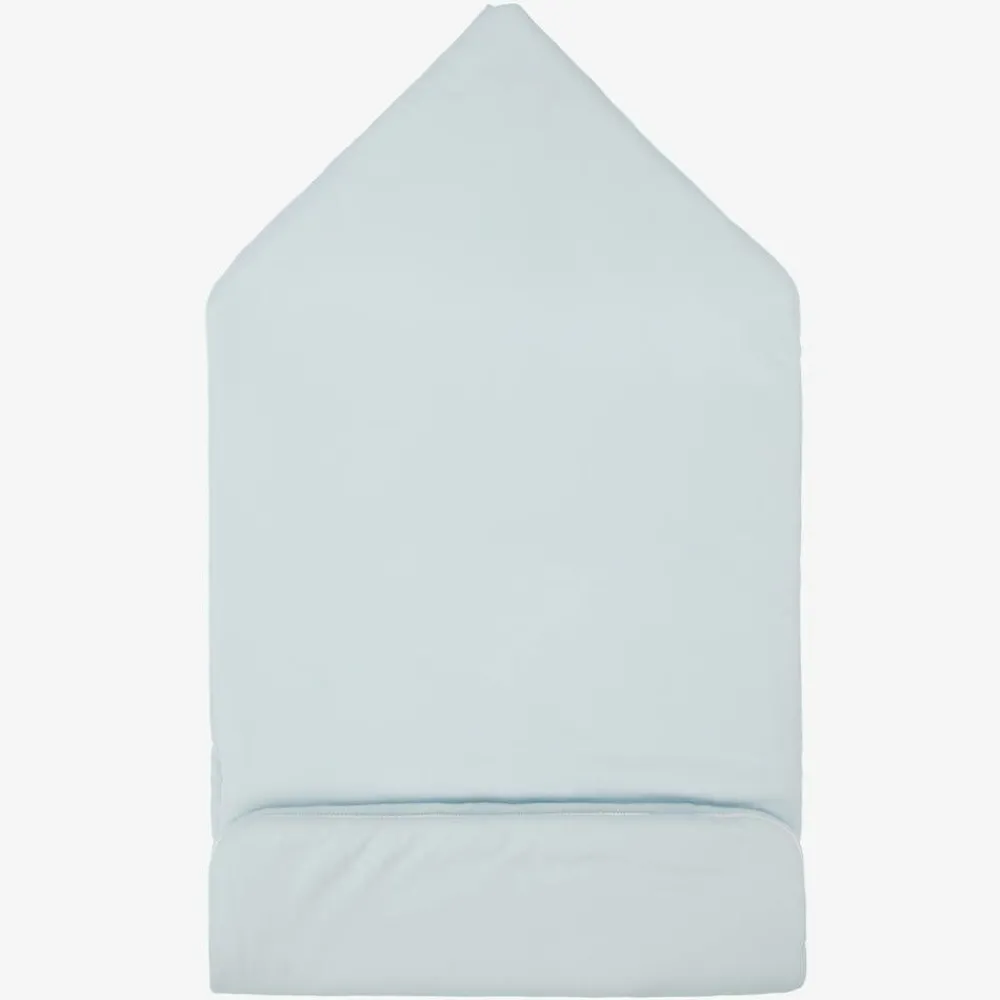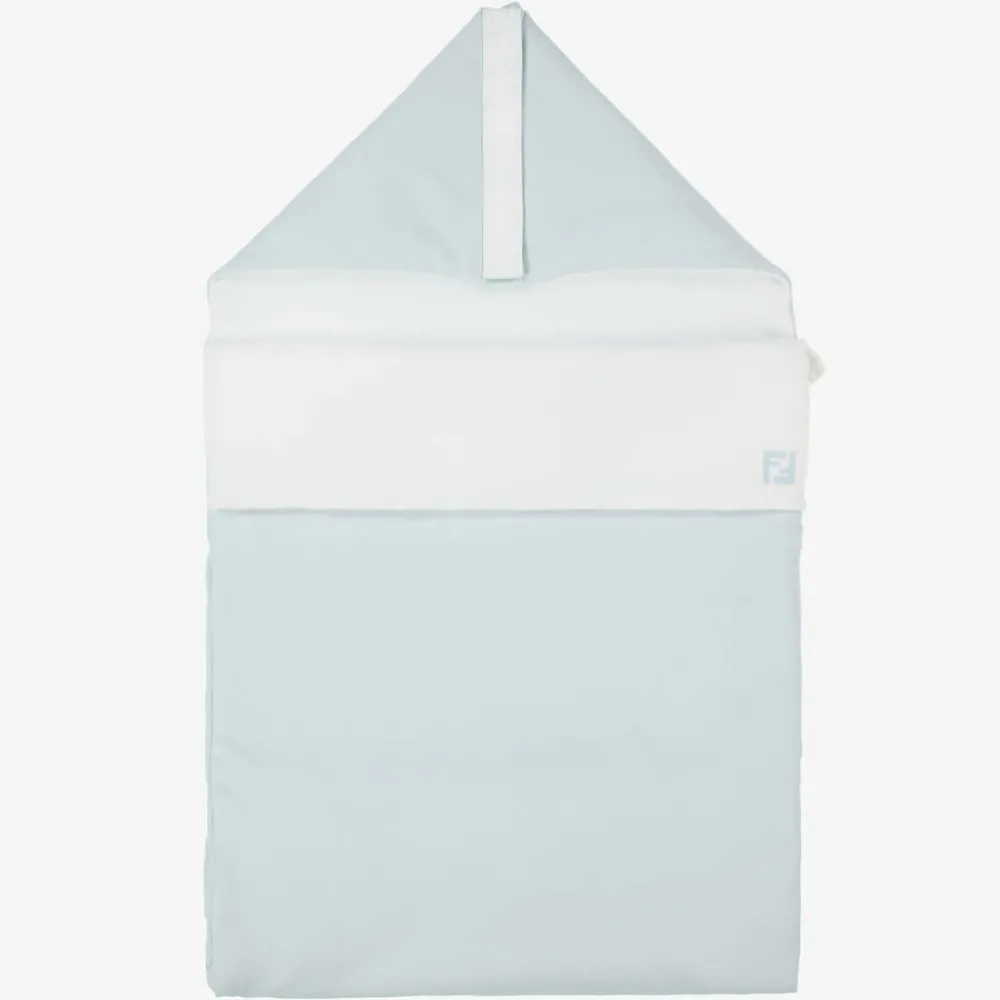 Pale blue and white cotton nest for baby boys and girls by Italian luxury brand Fendi. It is made and lined in super soft jersey and lightly padded for comfort. The hood is trimmed with delicately embroidered FF logo taping and there is a further embroidered beige logo on the front. The hood fastens with practical poppers and a zip fastening secures the side through to the bottom, allowing quick changing. The length is adjustable with poppers on the back.