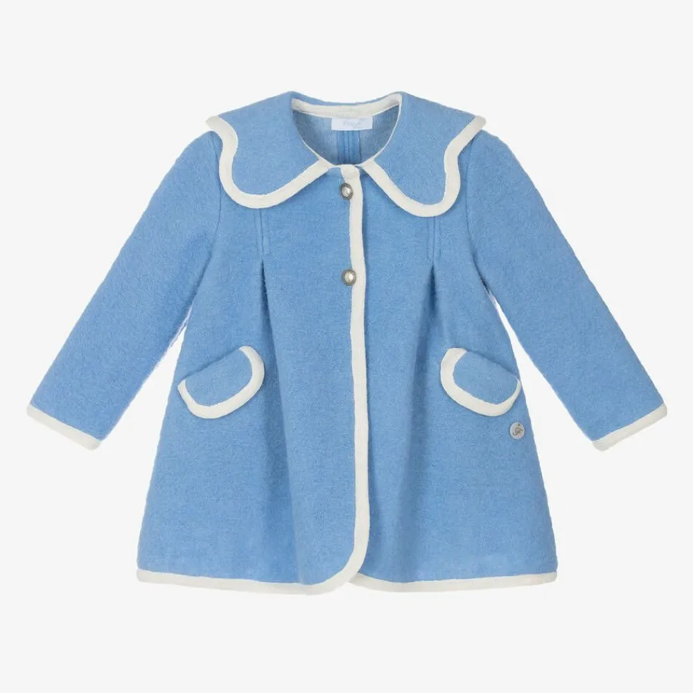 Pretty blue coat for girls by Spanish brand Foque, made in soft felted wool. It has a gentle A-line shape, with ivory knitted trims and pleats on the front and back. There are pockets on the front, a mother-of-pearl logo charm and silver metal button fastenings. The collar has lovely scalloped-shaped edging and there is a sweet ivory knitted bow on the back for a lovely finishing touch.