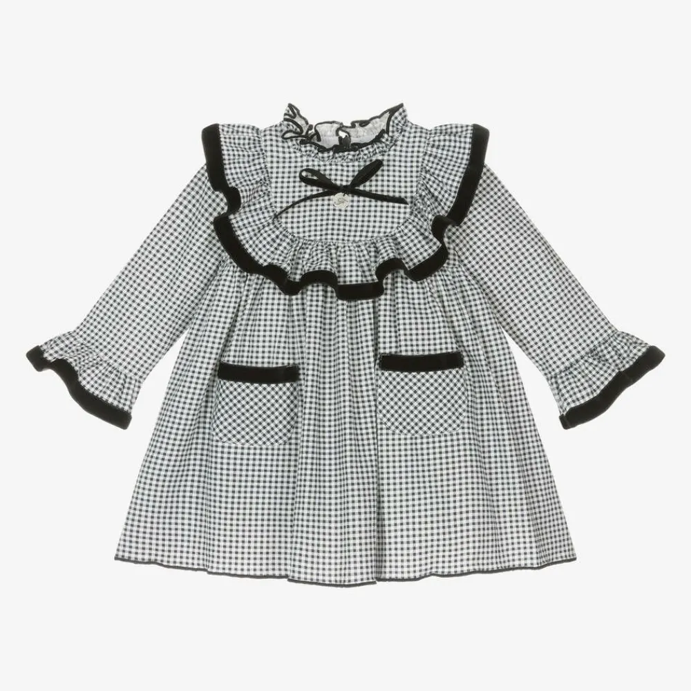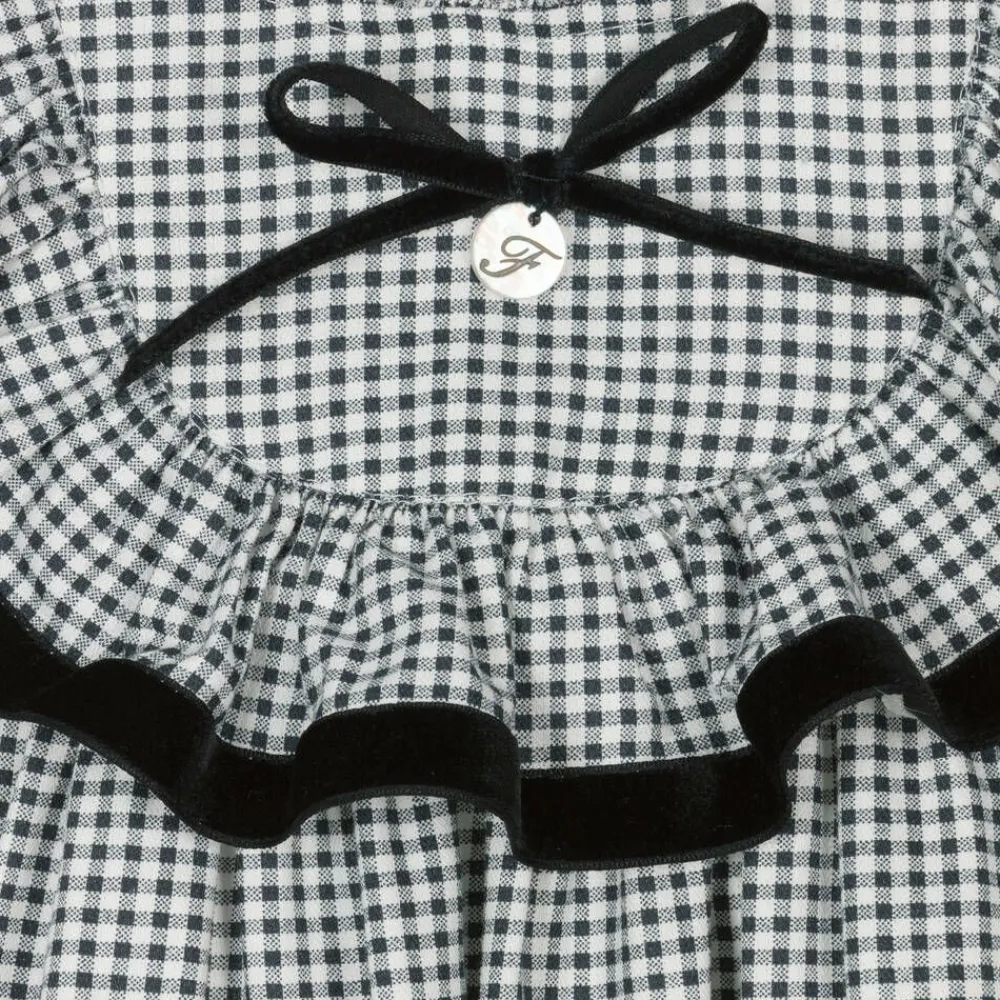 Black gingham dress for girls by Foque, made in cosy, mid-weight cotton and viscose. Patterned with lovely check, this classic dress has black velvet detailing, fluted sleeves, and ruffled edges. The bodice is signed with a discreet pearlescent logo charm attached to a decorative bow. The stand-up frill neckline adds elegance and the zip on the back is hidden for neatness. The cotton-mix lining completes the style with comfort.