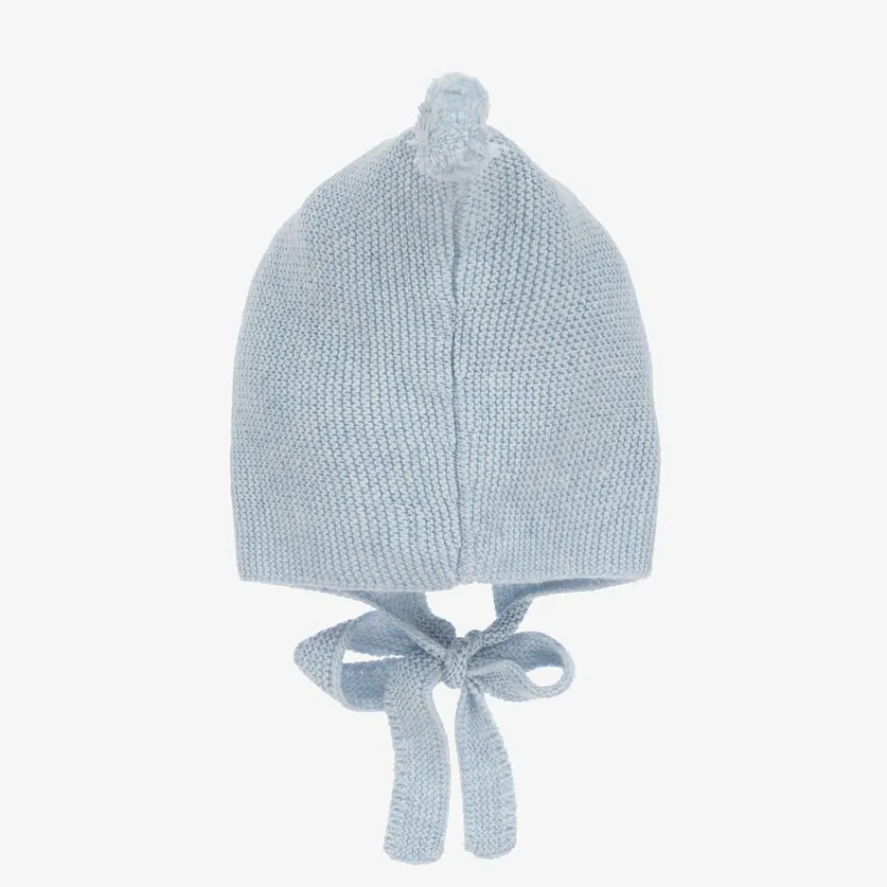 Lovely pale blue bonnet for baby boys by Spanish brand Foque. Knitted in a soft blend of viscose and wool, it has a touch of cashmere for added warmth and luxury. Fastening with knitted ties under the chin, it has a cute pom-pom on the top.
