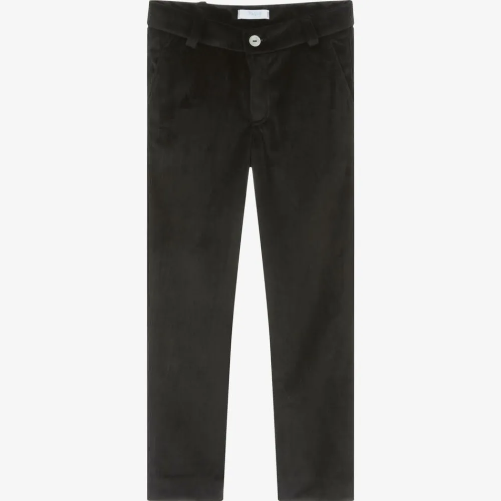Exclusive to Childrensalon, these smart black trousers for boys by Spanish brand Foque, are made in a super soft velvet. Comfortable to wear, they have front and back pockets, fasten with a pearlescent button and zip and have an adjustable waistband to ensure a good fit.