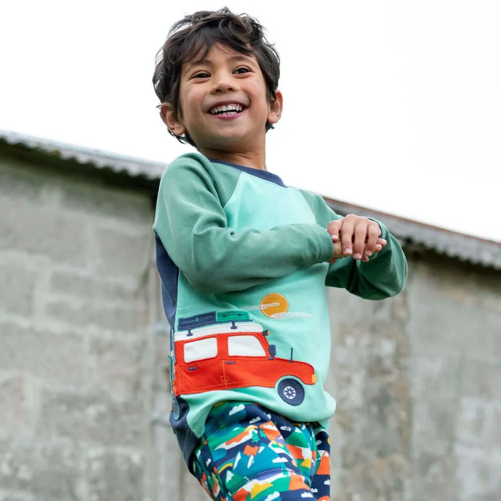 Boys green and blue long-sleeved top by British designer Frugi, made from soft organic cotton jersey. With a fun camping theme, this casual top has a wrap-around day and night scene, featuring car and tent appliqués. It has darker green raglan sleeves, with popper fastenings on smaller sizes.