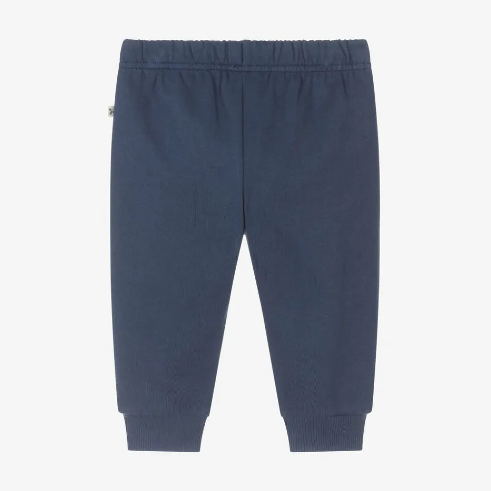 Blue joggers for younger boys by Frugi, made in soft, mid-weight organic cotton jersey. Fun and playful, there are colourful space-themed patches stitched to each knee. The elasticated waist adjusts with a mustard yellow drawstring for the best fit.
