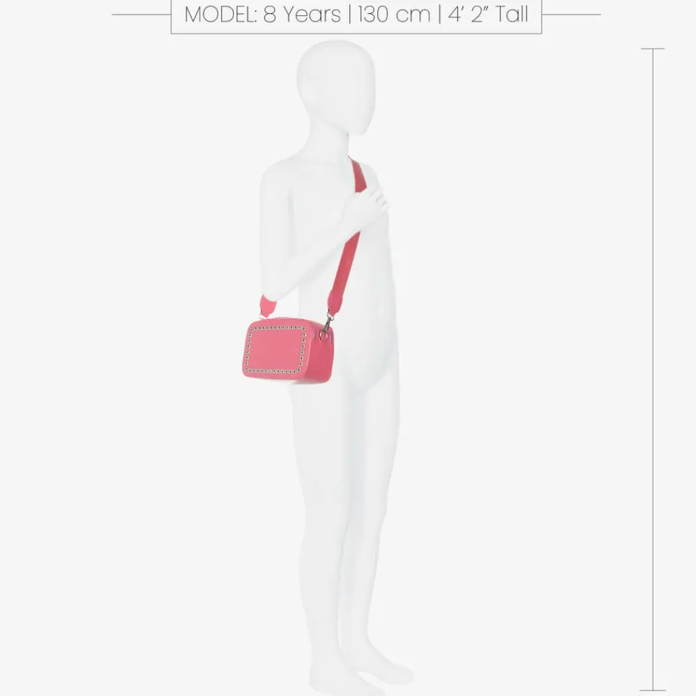 Bright pink faux leather shoulder bag for girls from H.Love by Fun & Fun. Ideal for carrying essentials this compact bag has an adjustable strap for shoulder or cross-body wear. The double zip fastenings and silver studs on the front give an alternative finish.