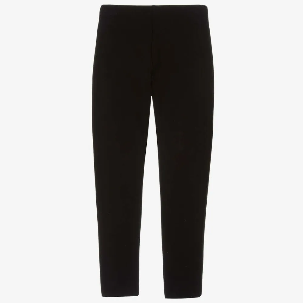 Black full-length leggings for older girls from H.Love by Fun & Fun. Made from a soft viscose-blend Milano jersey, they have shiny gold stud-inspired button embellishments on the front for an edgy finish. The waistband is elasticated to ensure a comfortable fit.