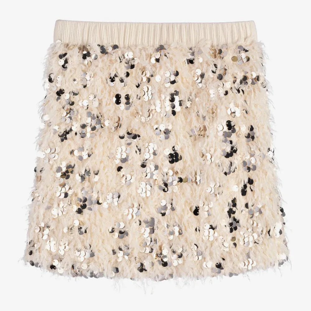 Glamorous ivory skirt for girls by Fun & Fun, ideal for a party. Adorned with luxurious faux feathers and sparkling sequins, it is made in soft jersey with an elasticated waist for comfort.