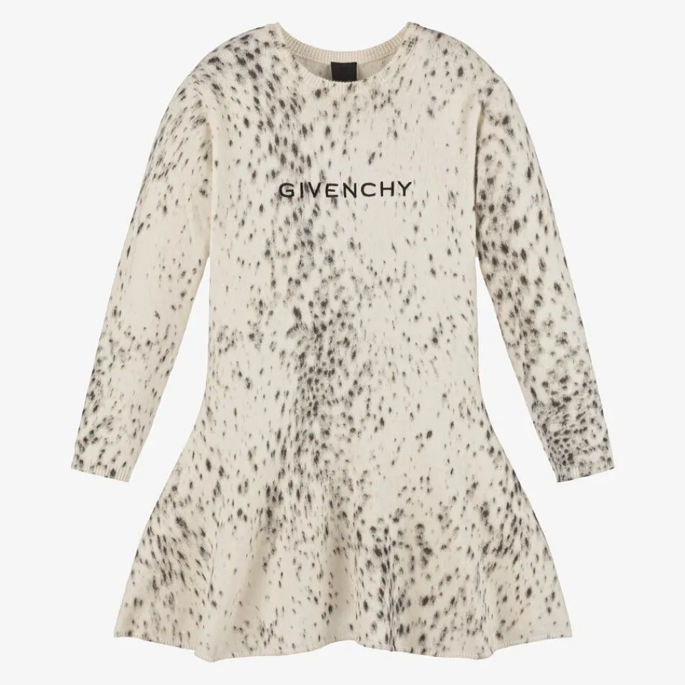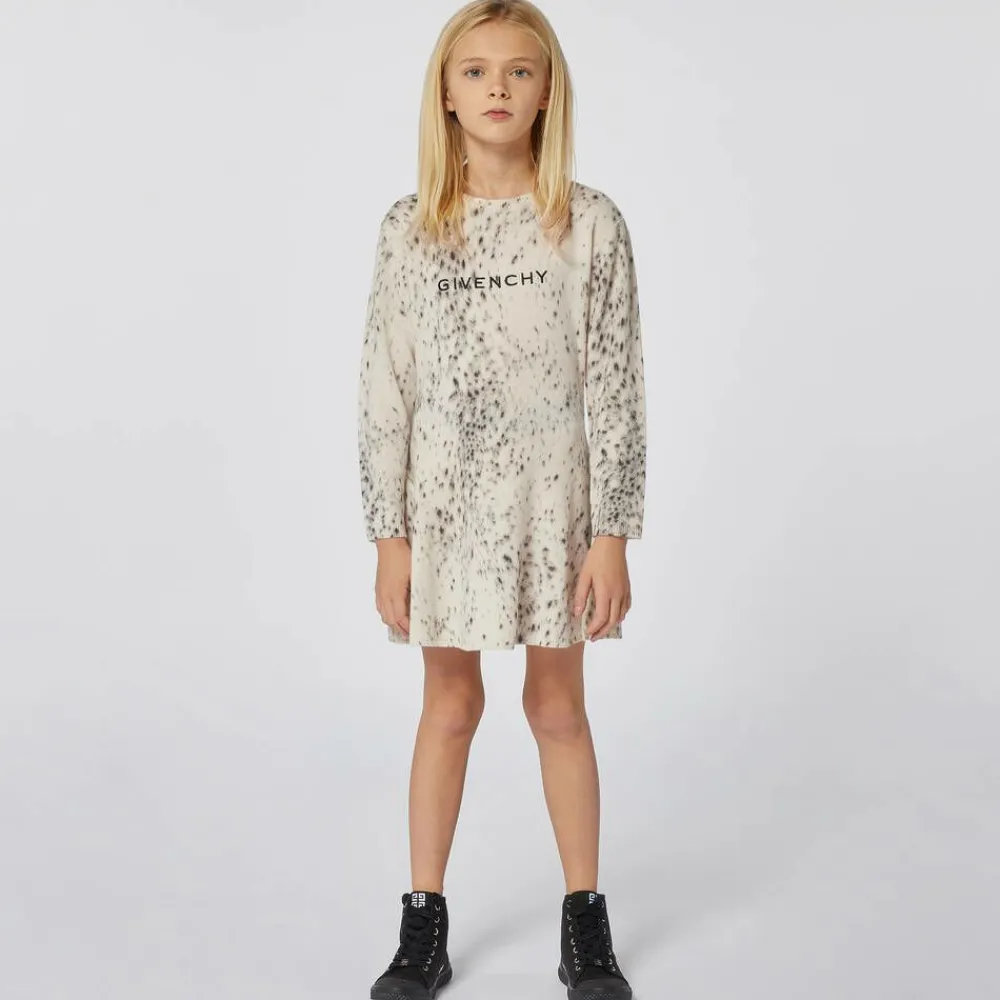 Inspired by Givenchy's main collection, this ivory dress for girls is patterned in a beautiful grey ocelot print. It is knitted in a luxuriously soft wool blend with ribbed trims and a chic fit and flare silhouette. Adding an unmistakable designer touch, the French label's embroidered logo can be seen on the front.
