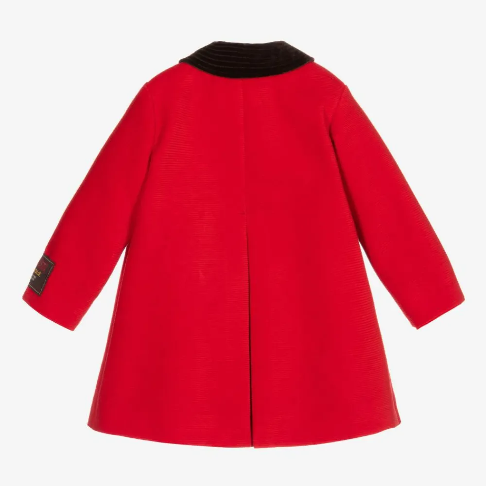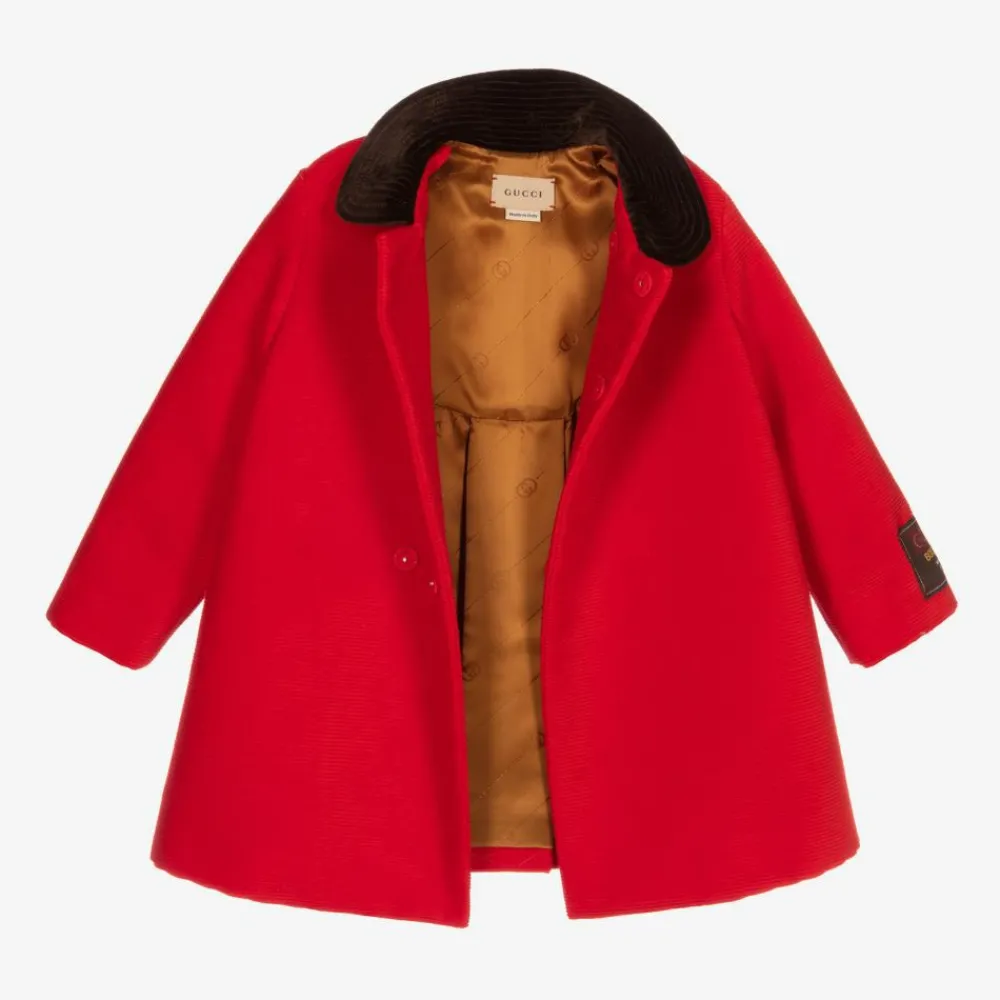 Little boys red corduroy coat by luxury Italian designer Gucci. Lined in silky quilted viscose, this smart, vintage-style cotton coat has a Gucci Boutique label on one sleeve and a soft brown velvet Peter Pan collar. There are decorative tortoise shell buttons above the front popper fastenings.