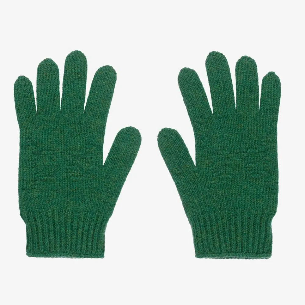 Green gloves for boys and girls by luxury Italian brand Gucci. Made in soft wool, they have ribbed trims and the brand's GG logo embroidered on the back of the hands.