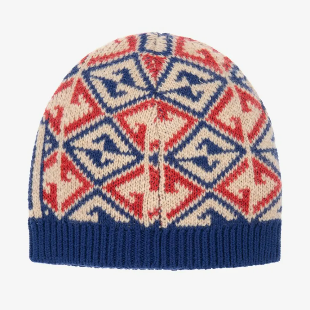 Cool red and blue hat for baby boys and girls by Italian luxury brand Gucci, knitted from a soft wool and cotton blend. On a beige background, it has an all-over red and blue intarsia GG logo pattern, with an off-centre blue box logo.