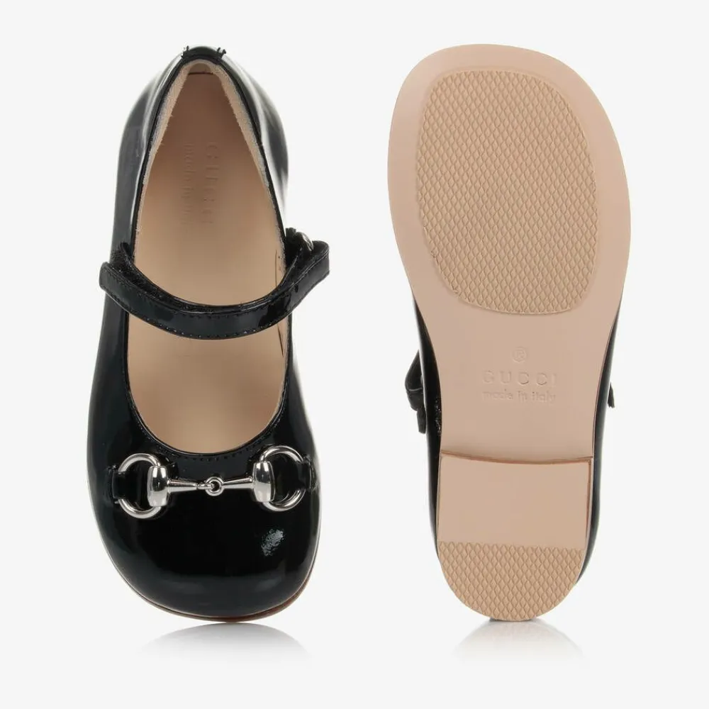 Smart black ballet flats for younger girls by luxury Italian designer Gucci, made in shiny patent leather. They have silver horsebit detailing across the toes, a nod to the brand's equestrian history. In a timeless Mary Jane style, they fasten with an adjustable, single velcro strap. Comfortable to wear, they have a soft leather lining and insole. The sturdy leather sole has non-slip rubber pads for a good grip.