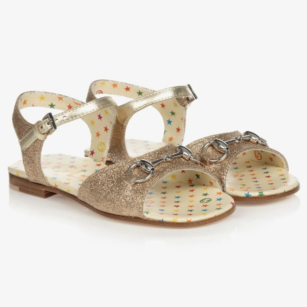 Girls glittery gold sandals by Italian luxury brand Gucci, with the signature silver metal Horsebit detail. Lined in soft ivory leather printed with a colourful star and Interlocking G logo pattern, they have buckle-fastening on the ankle strap. They are made in glitter-coated fabric with metallic gold accent, and the outsole has non-slip rubber pads for good grips.