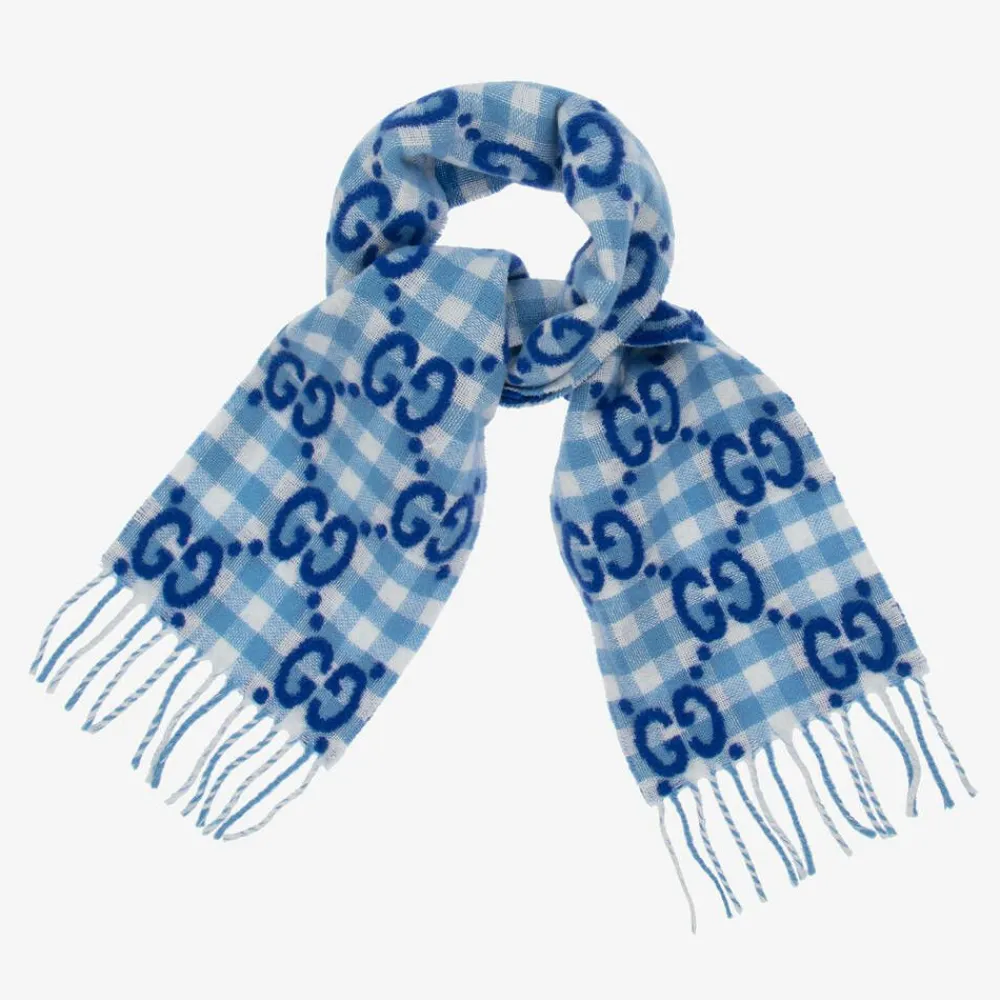 Luxury blue and white Mini-me scarf for boys and girls by Italian brand Gucci. It is patterned with the brand's iconic GG logo monogram in bright blue, over the blue and white gingham check pattern. It is woven in warm and cosy wool jacquard with fringing on both ends.