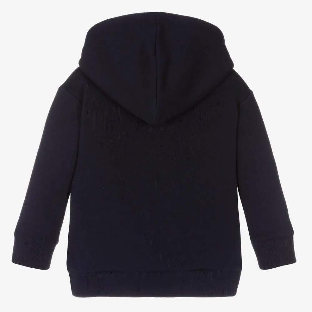 Navy blue hoodie for little boys from Italian luxury designer Gucci. This comfortable design is made in stretchy cotton sweatshirt jersey with softly ribbed trims and a distressed, raw edge detail on the neckline. The brand's white 'Gucci Band' mirrored logo prints decorate the front, with a whimsical orange cat patch in the centre, knitted in a wool mix for a cool multi-textural design.
