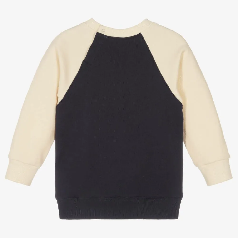 From luxury brand Gucci, a navy blue cotton sweatshirt for little boys. It is crafted in soft, medium-weight jersey with ivory raglan sleeves and softly ribbed trims. This casual design is enhanced by the Italian label's yellow logo print, with 'Band' lettering, an embroidered Interlocking G motif, and torchon detail in the iconic red and green Web. It fastens easily on the back with concealed poppers.