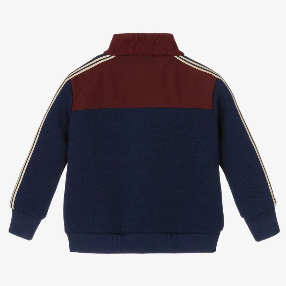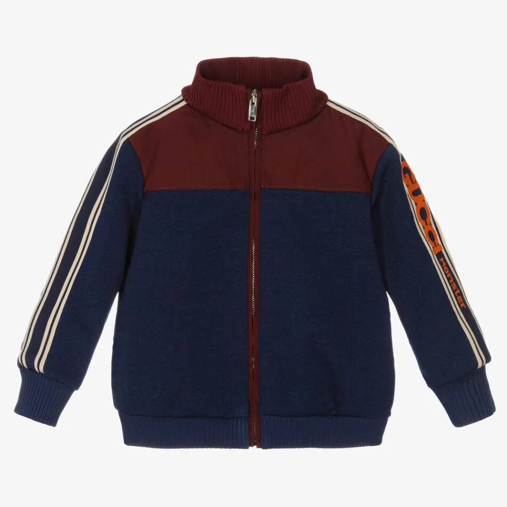 Sporty navy blue zip-up track top for little boys, by luxury Italian designer Gucci. Symbolic of the House codes, it has the iconic GG jacquard logo all-over, with a contrasting burgundy red ribbed collar. Trimmed with a vibrant 'Gucci Monster' stripe down the sleeves, this logo-inspired jacket combines the look of retro sportswear and comfort.