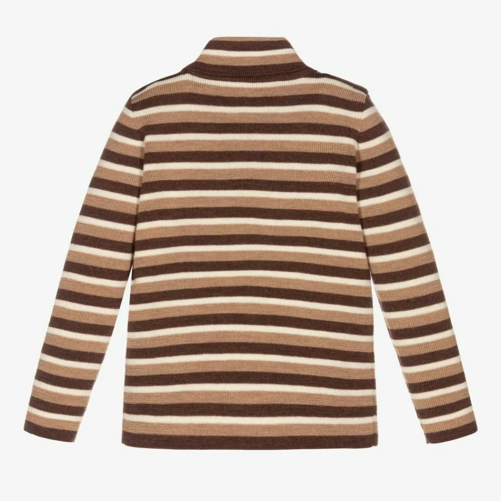 Younger boys and girls wool roll neck sweater by luxury brand, Gucci. Forming part of the Ouverture collection, this retro-inspired knit in ivory, brown and camel stripes is soft and stretchy, with an intarsia weave of the design House's classic logo in dark brown.